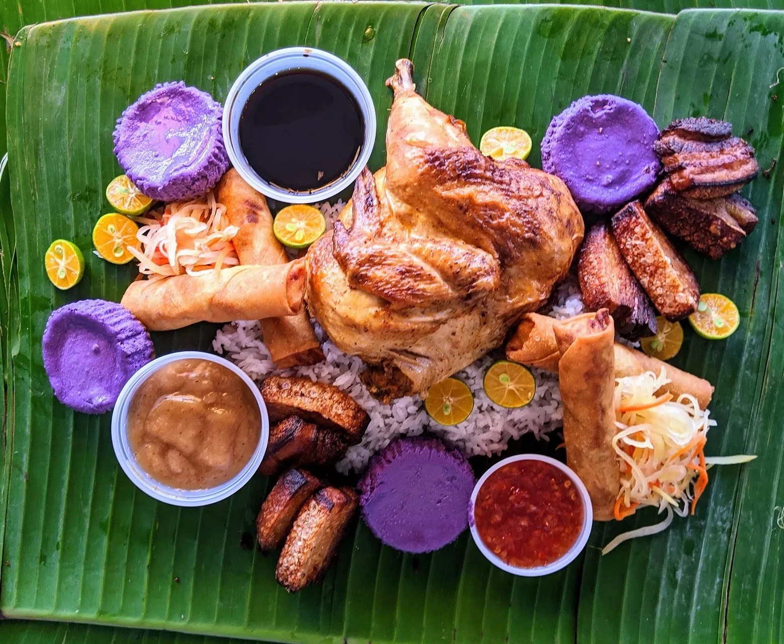 The Kamayan take-home dinner from Phx Lechon Roasters includes lechon manok (rotisserie chicken), lumpia, lechon kawali (crispy pork belly), and rice.
