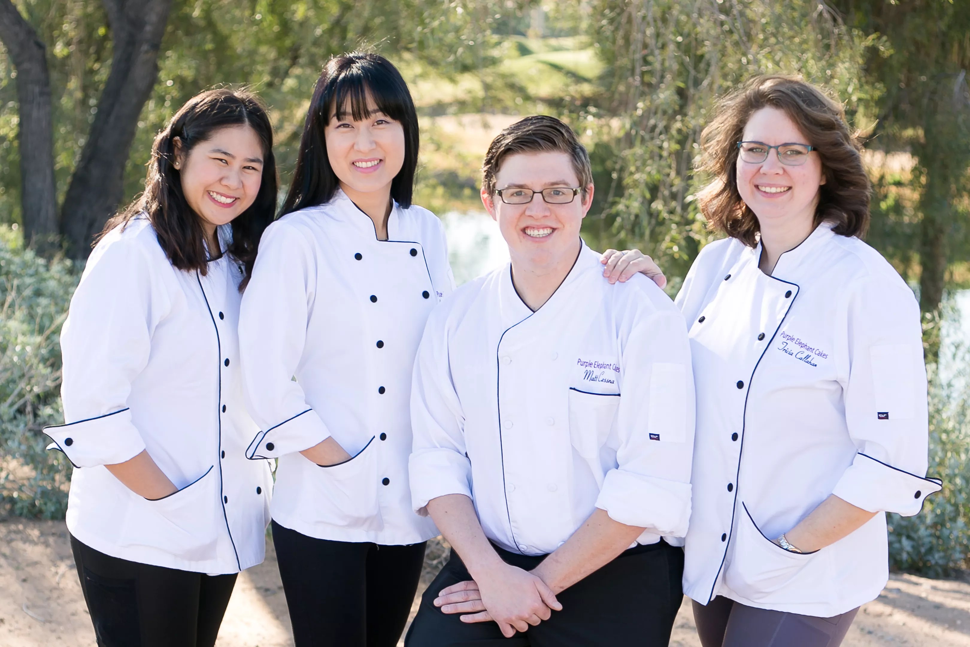 The current Purple Elephant Cakes team. Left to right: Jutapich Chotisathianphong Woodman (cake designer), Jin Hee Sonu (founder and cake designer), Matthew Cessna (baker), Tricia Callahan (head cake designer).