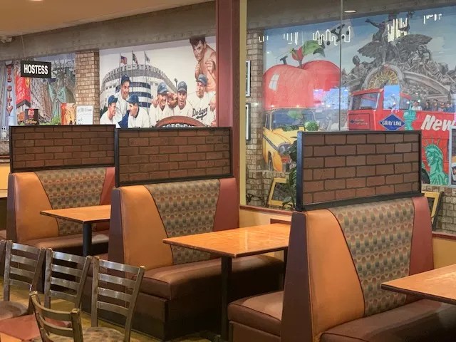 At all five locations of Chompie’s Restaurant, Deli, and Bakery, tables are six feet apart, floor markings act as reminders in the line-up area for the bakery and deli counters, plexiglass shields are up near the registers, and faux-brick partitions have been erected between booths.