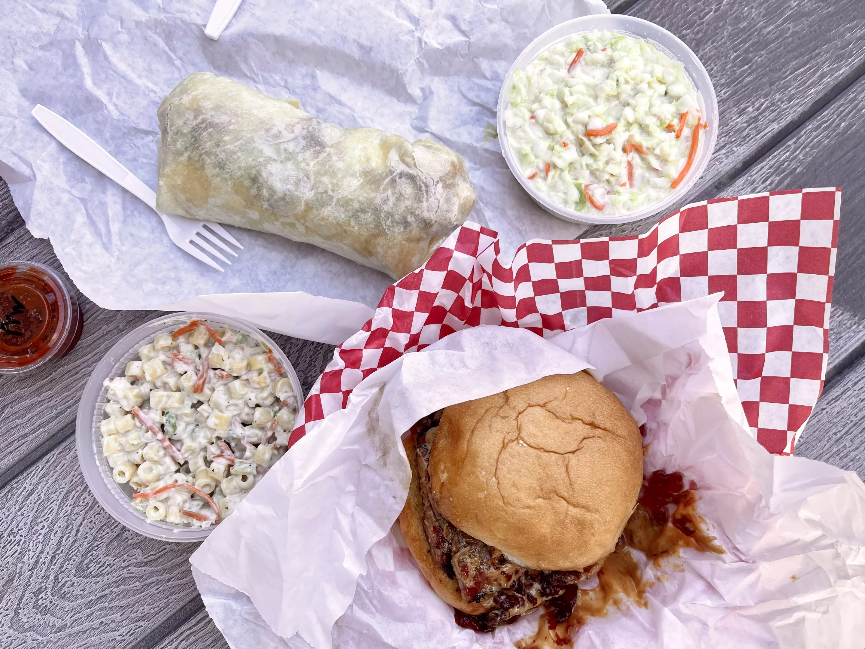 Sides of creamy coleslaw and macaroni salad pair perfectly with sandwiches and burritos at Jalapeño Bucks.