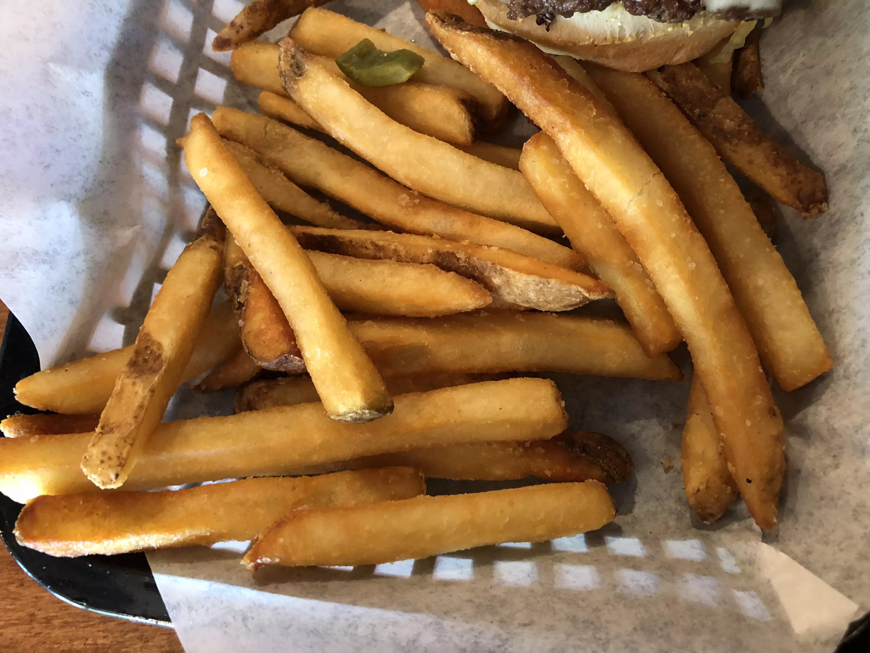 The fries are good. They are long and thick and flecked with potato skins on the slanted ends or sides. A coarse salt visibly spots them. It has been flurried on with a heavier hand.