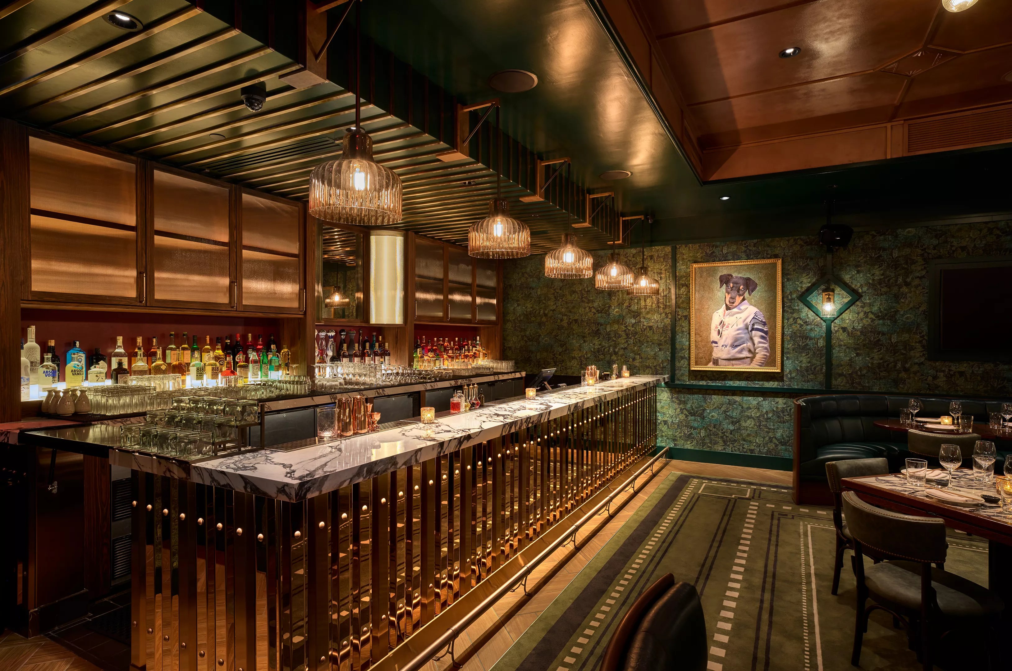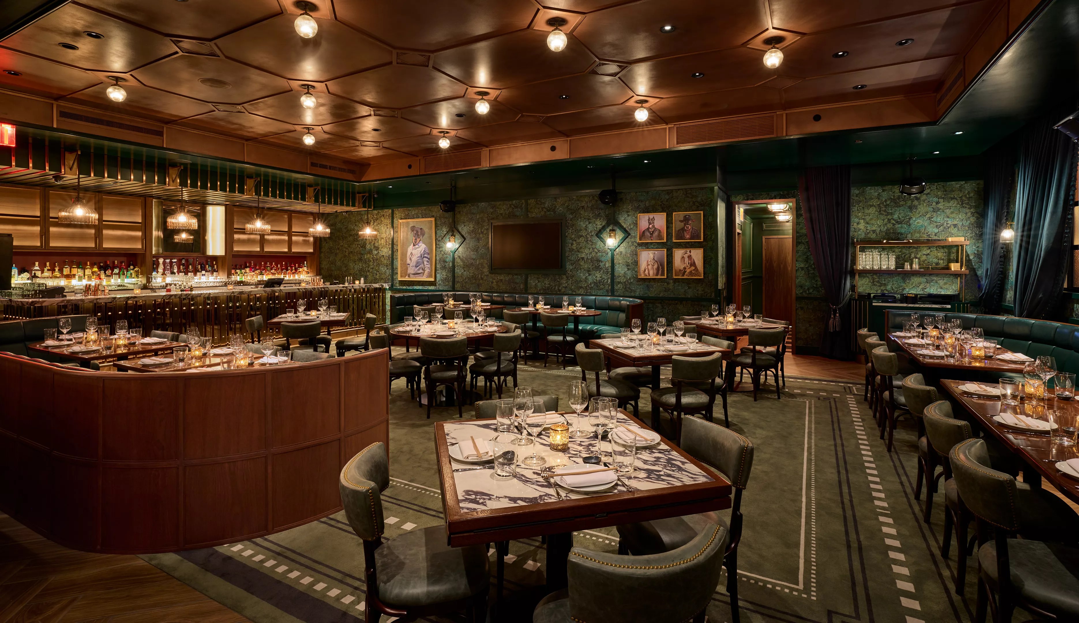 The Emerald Room is a richly designed space featuring green leather banquettes, floral wallcoverings and emerald and copper accents.
