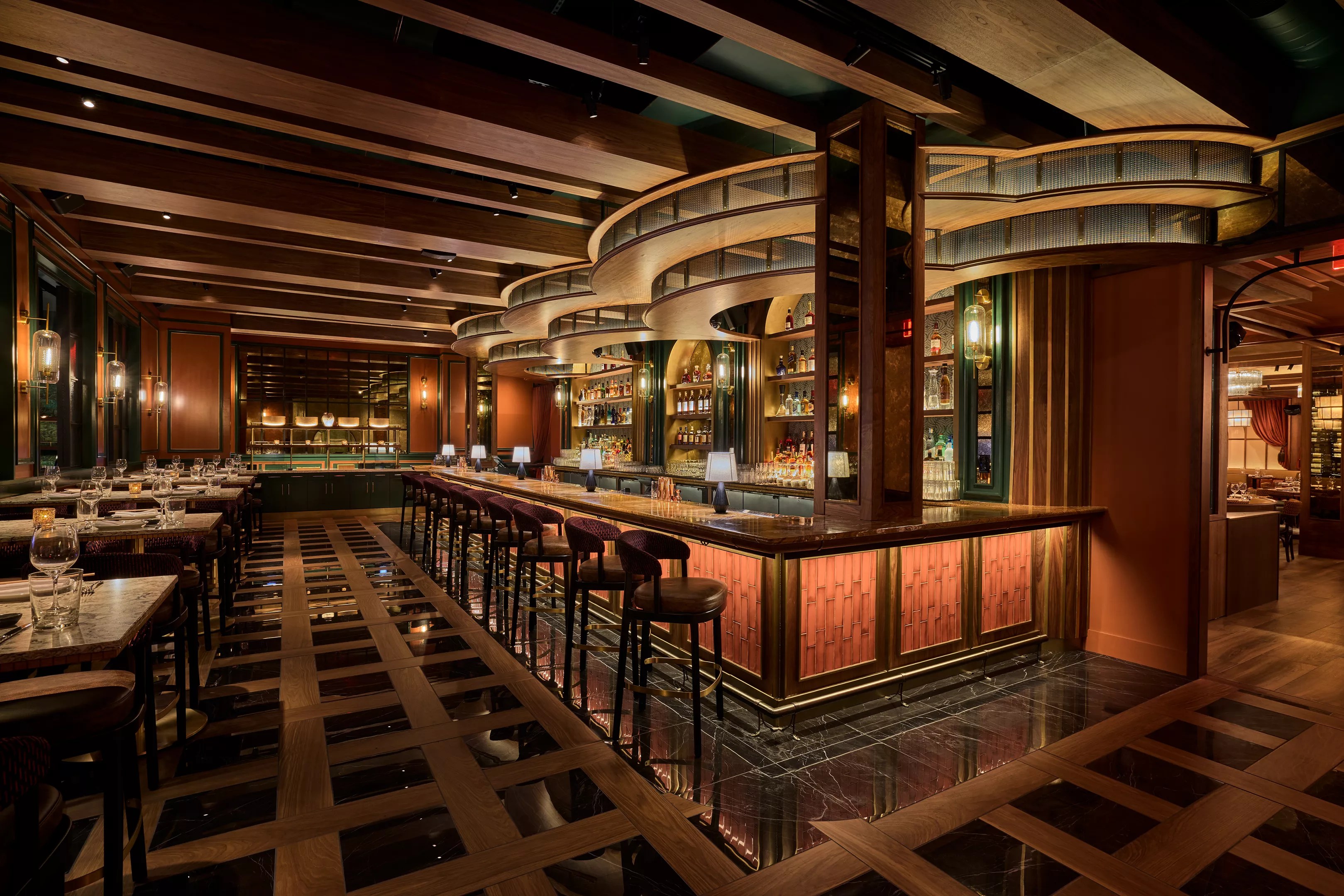 The restaurant’s luxurious dining room, bar, sushi bar and private dining space, including a rich jewel-toned Emerald Room, span 11,700 square feet. The Rockwell Group designed a space that blends desert modernism with a West Coast-inspired palette, using touches of limestone, layers of green, terracotta, wood and oil-rubbed bronze.