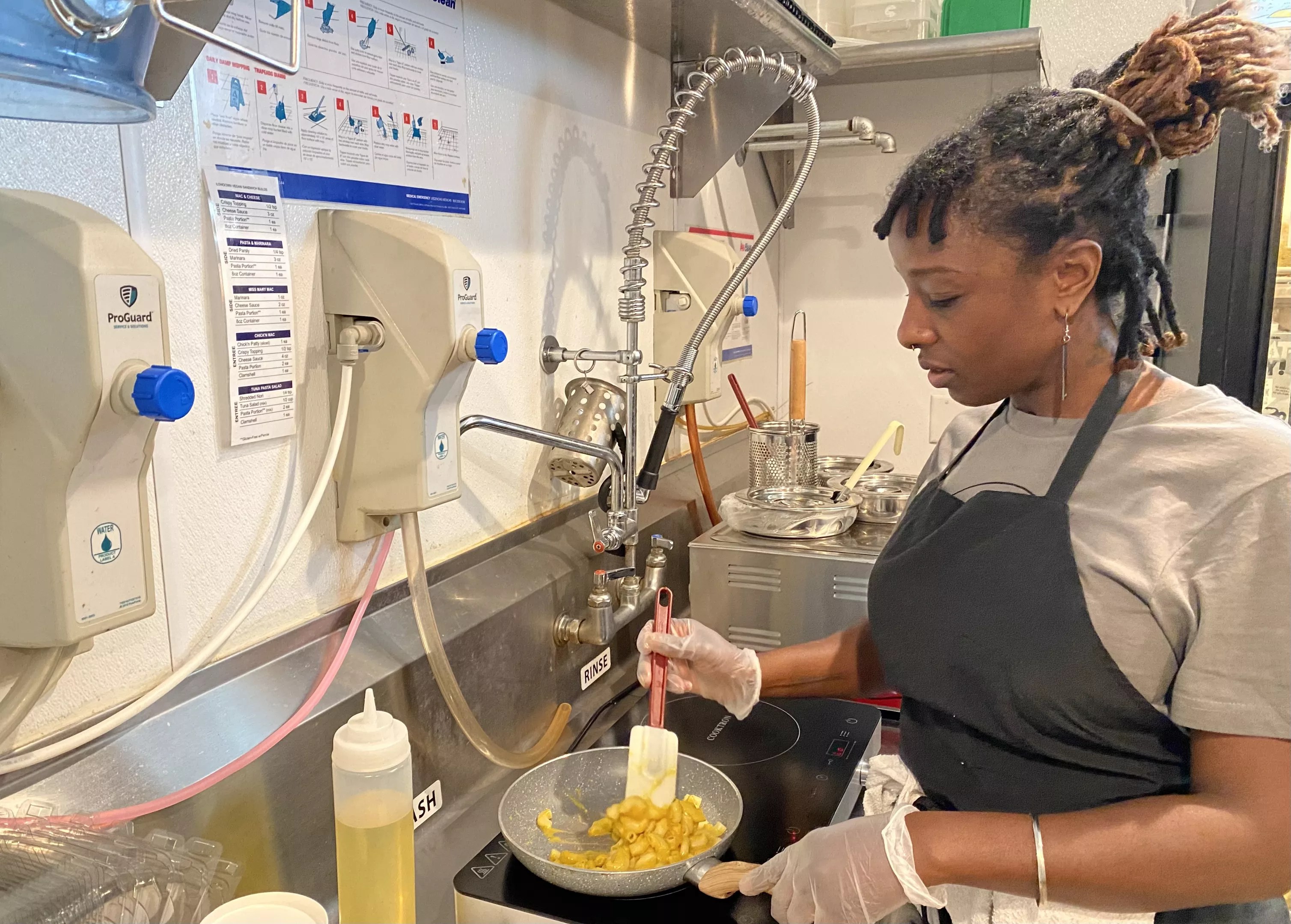 Jai Jones, co-owner of Lowdown Vegan, prepares an order of Mac & Cheeze.