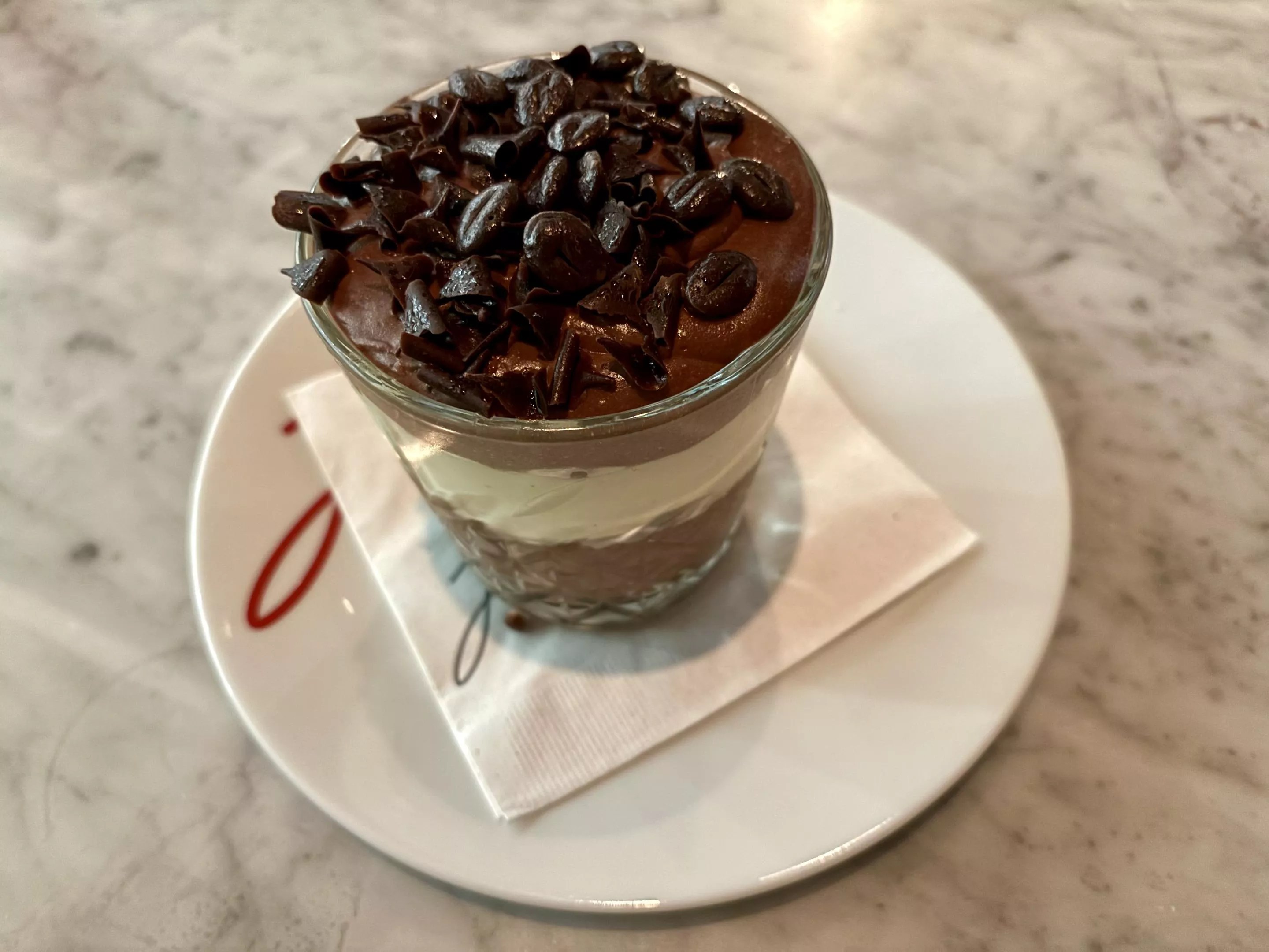 We tried the tiramisu, which came in a rocks glass and was big enough to share. Layers of chocolate cream played like the contents of a pudding cup and weighed down the delicate lady fingers below until they almost were dissolved. But overall, it was sweet, creamy and full of chocolate flavor – perfect if you love pudding.