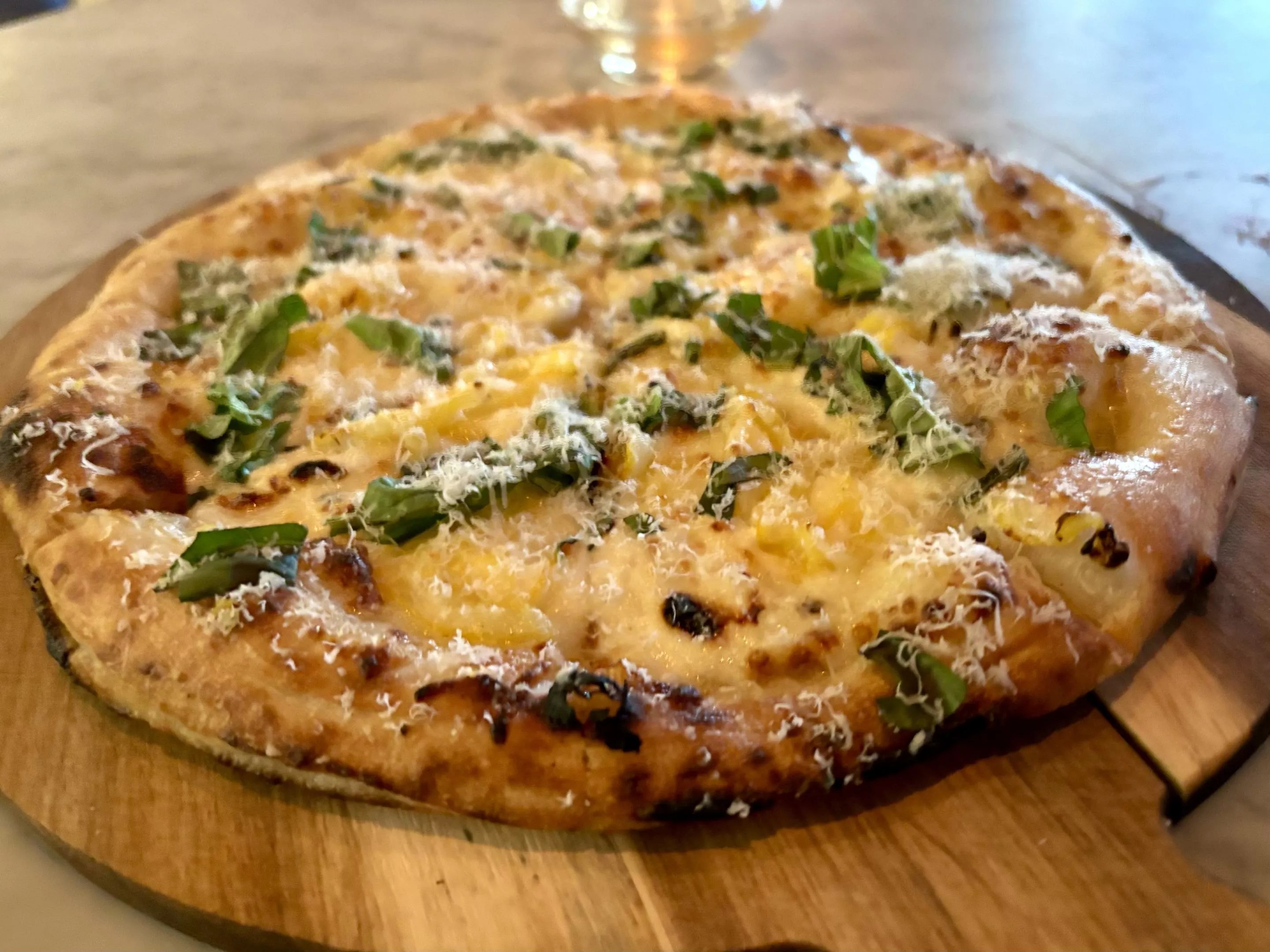The celebrity chef also has put a spin on her signature pasta by creating lemon pizza, a new dish available only at Luna by Giada. Our server, after admitting he doesn’t love the lemon spaghetti, pointed us to the pizza instead. The white-sauce pizza topped with garlic creme and lemon slices came on a doughy crust missing any kiss of color. And instead of a pop of much-needed acid, the lemon skins brought only bitterness, failing to cut through the thick layer of cheese.