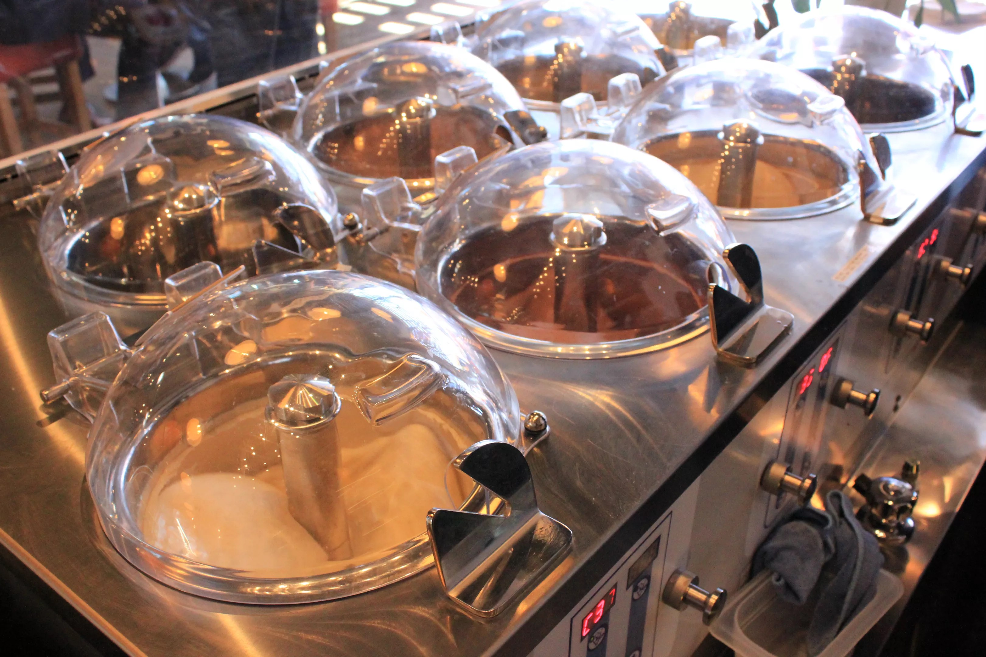 This machine constantly spins gelato, arms churning what looks like soft serve. Fabbri makes gelato directly in these tins. He pours a gelato base onto the spinning arms, and 15 minutes later gelato is ready.