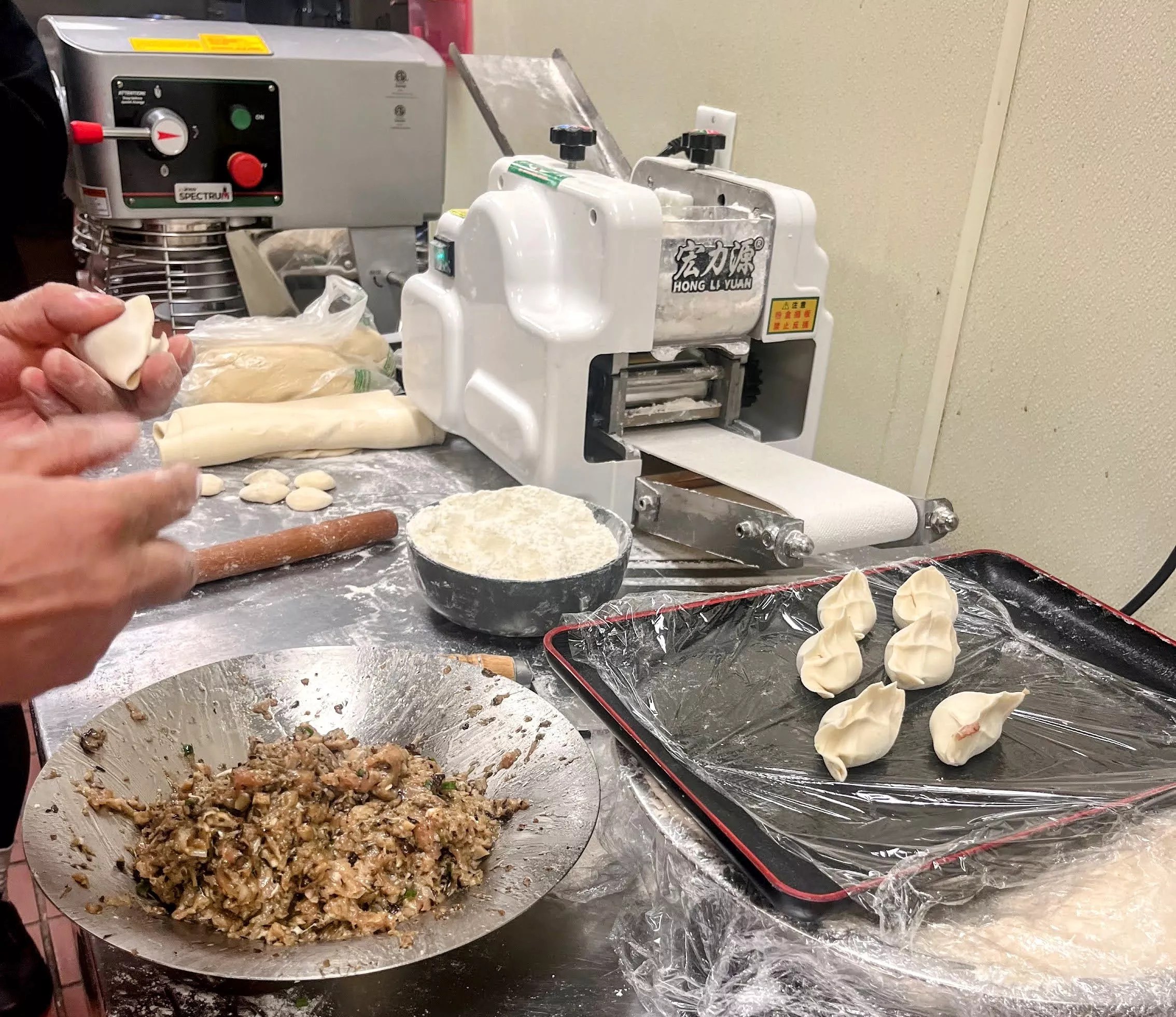 Cai’s business partner, Wang, makes their signature dumplings. First, he grabs a fistful of water-based flour, forming half-dollar-sized pieces and flattening them with a dough roller to create thin, wide wrappers. Each is topped with ground pork, shrimp, and chives, then closed and pressed to form a half-moon-like shape.