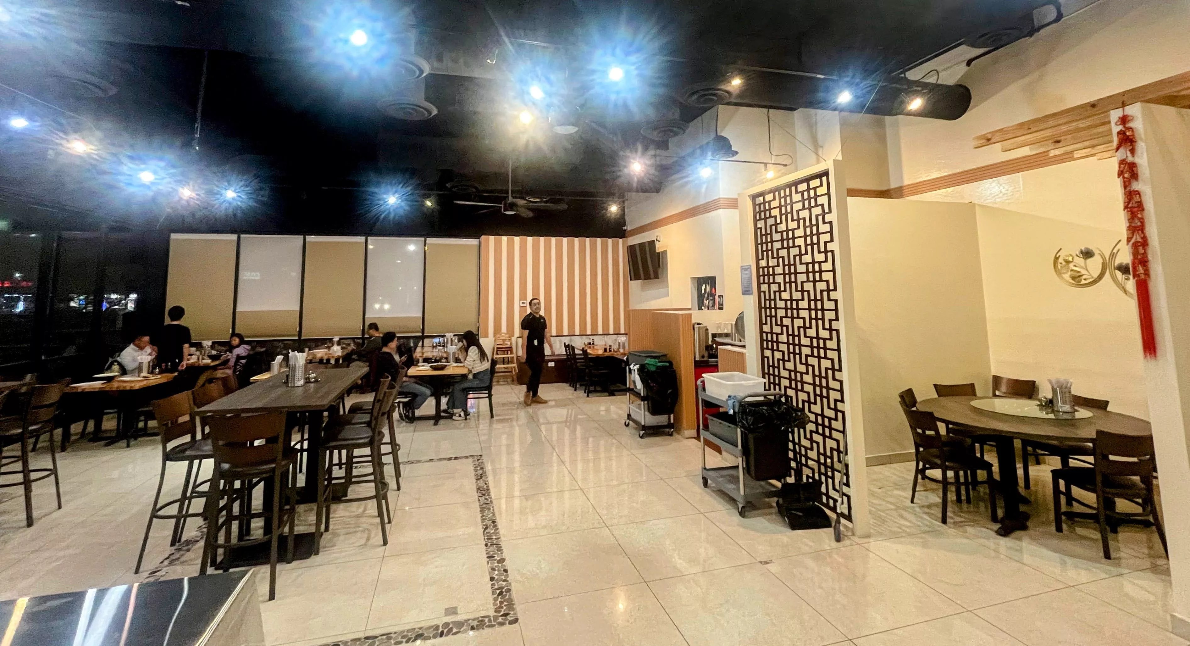 The inviting dining area features shiny marble-like tiles, high, matte black ceilings, a spread of tables and two VIP dining spaces with round tables and lazy Susans. Decorative touches include a Chinese hot pepper-inspired ornamental knot with a tassel, framed paintings, Chinese TV shows playing on the screens and a ceramic fat cat for luck. A self-order kiosk near the entrance caters to diners on the go.