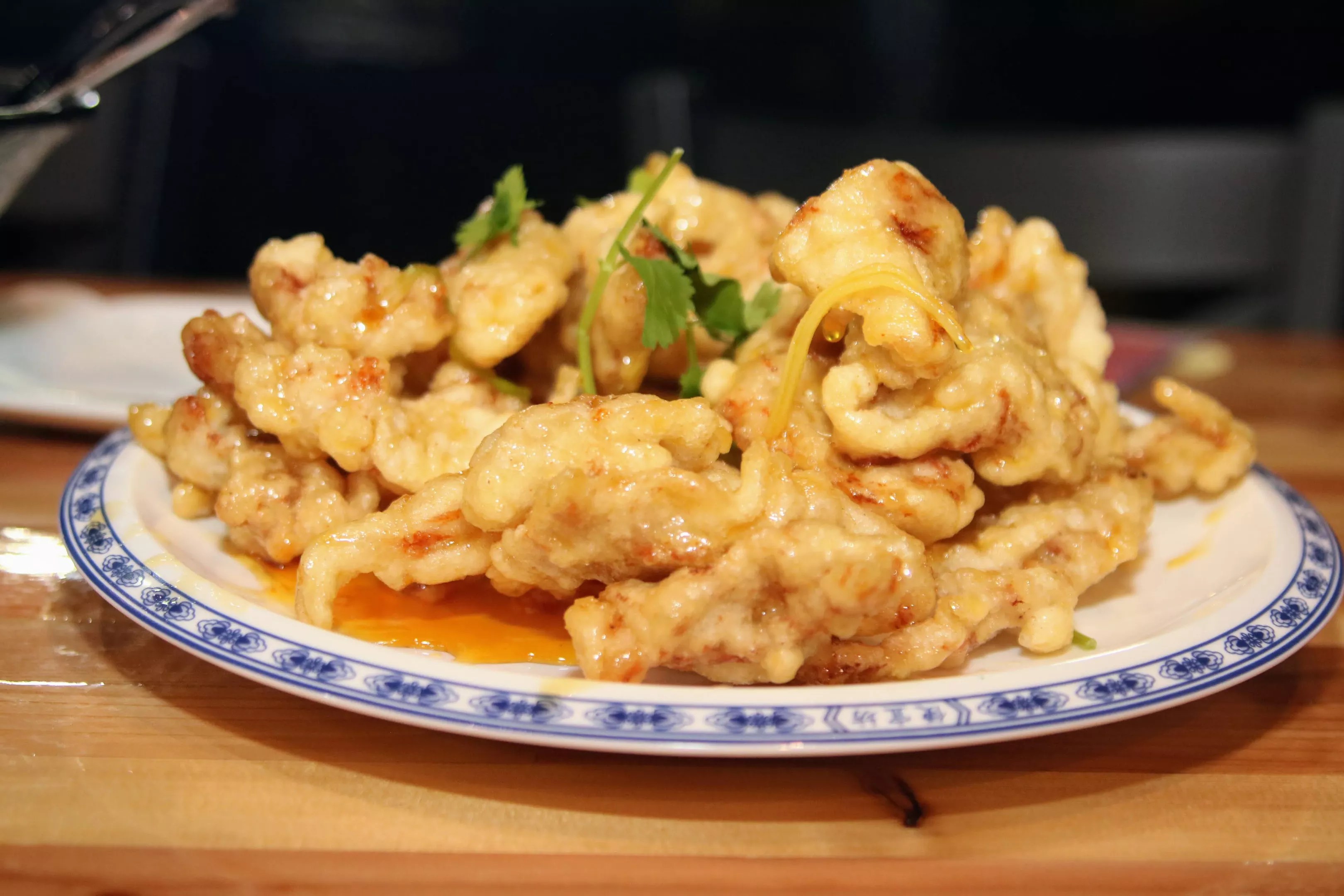 The dish features thin slices of pork tenderloin coated in batter, fried with ginger and cilantro and crisped to perfection.