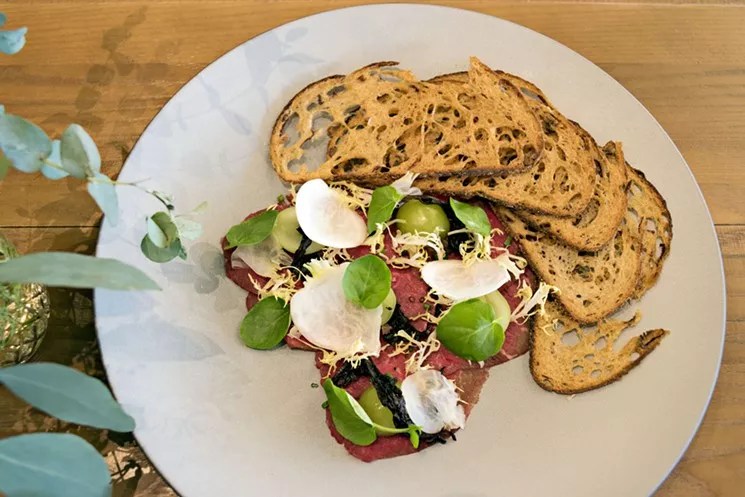 Fine dining has traditionally been a staple of the Valley’s luxury resorts. But a new breed of restaurant – modern and sophisticated, yet also casual and approachable – is popping up at some of the swankiest resorts in town. Mowry & Cotton, which debuted at The Phoenician last fall, is part of this new generation of Valley resort restaurants. It takes over the sprawling, ground level space formerly occupied by Il Terrazzo, a fine dining Italian spot. The space has been refashioned into a crisp and airy modern American restaurant, faintly tinged with the airs of a modern Western farmhouse. Mowry & Cotton is all about shared plates, often seasonal ingredients cooked by fire, served around a communal table. Their fresh-out-of-the-oven buttermilk buns, flame-cured vegetables, and bison carpaccio are all highlights. The natural salty richness of the carpaccio dovetails beautifully with a lovely, crisp salad of radicchio, thinly-sliced turnips, and grapes.