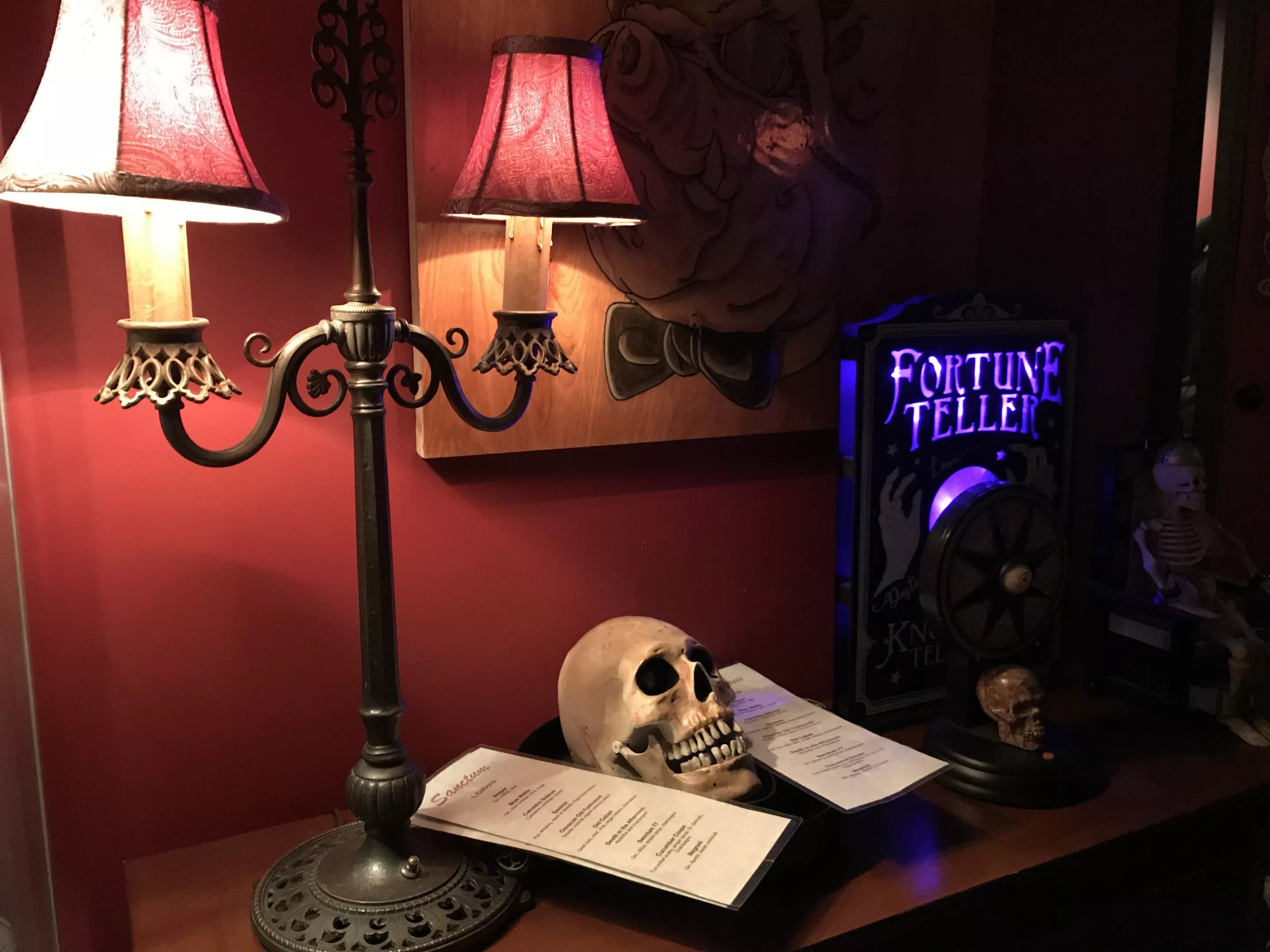 Boehme encourages his guests to come neatly dressed, composed, and with an open mind. Once the doorbell is rung and the password spoken (usually inspired by ancient mythology), guests enter a dimly lit room filled with velvet, chandeliers, and gargoyles. And specifically for the month of October, vintage Walgreens decorations are only on display to celebrate Halloween.