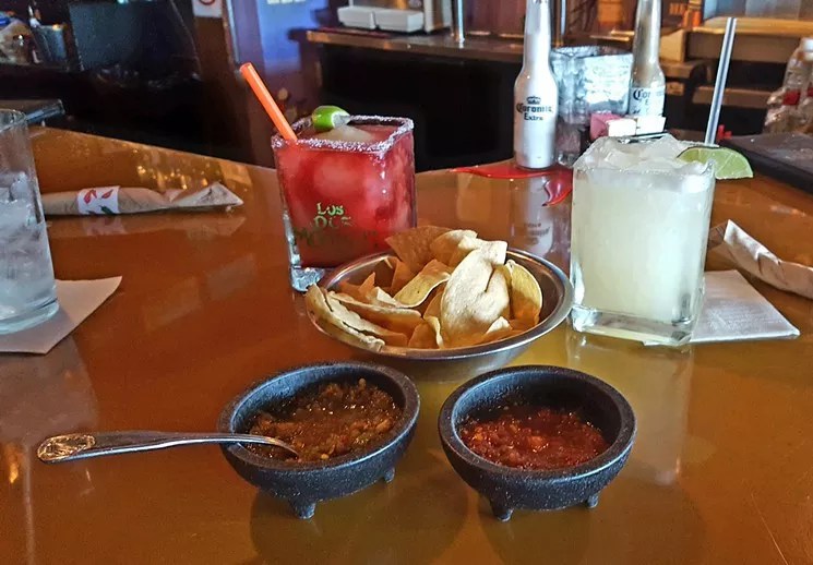 Los Dos Molinos’ specialty margaritas pair well with the restaurant’s hot green and red chile salsa.
