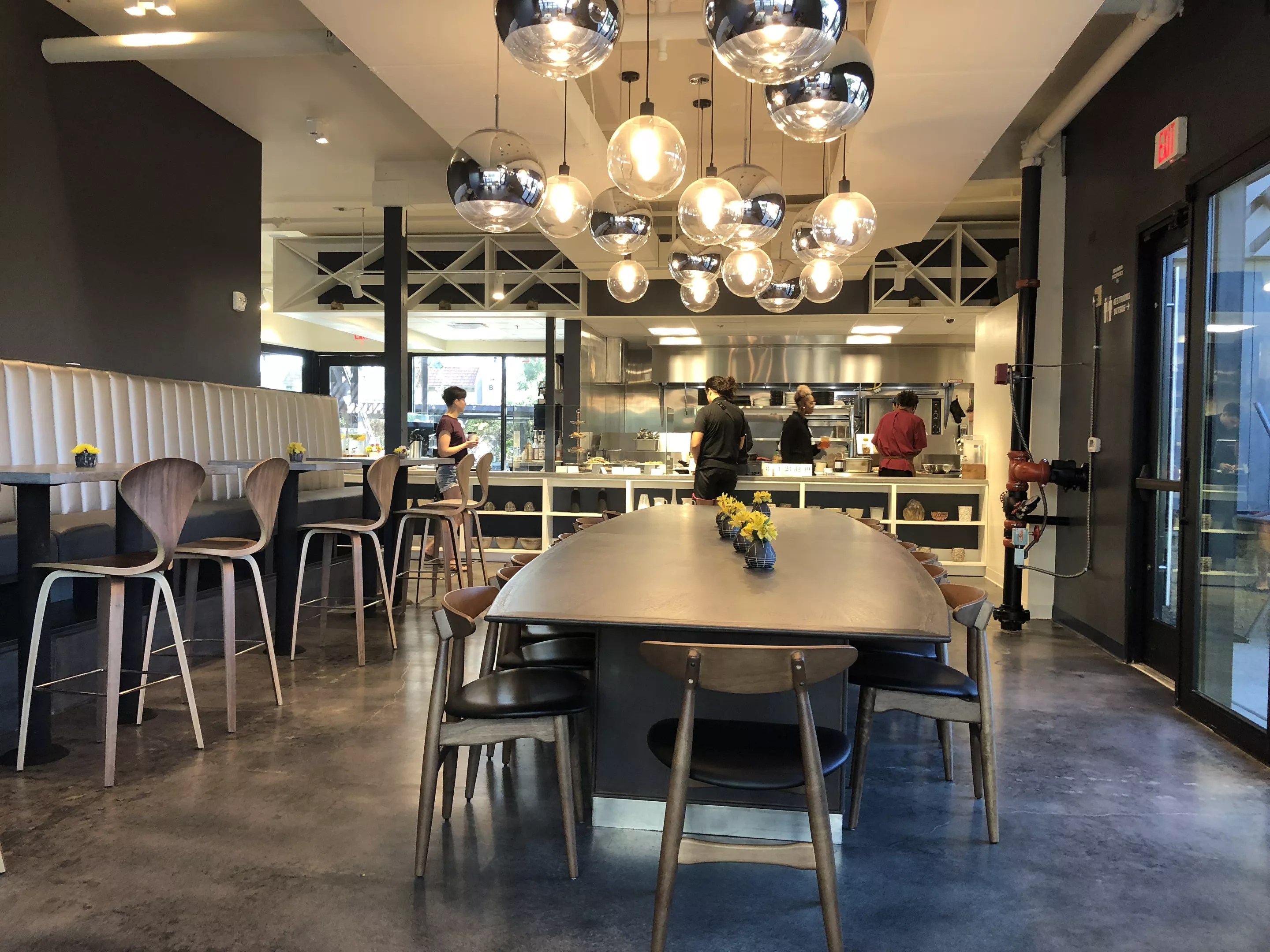 The 90-seat (in and out) restaurant does counter service. Service is attentive and you will be furnished with the Wi-Fi password, and perhaps sit at a central communal table, where people are encouraged to linger and crank out work in the morning hours. An open kitchen bustles and slants, “L”-wise, to the prepared food section and then nook of coffee and iced tea. Globe lights hang. Back windows admit sunlight.