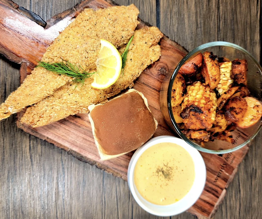 After hand-breading the banana blossom, they fry it to a deep golden brown, the final product resembling a cod fillet. It’s served with a classic seafood boil mix of corn, potatoes, crab-less meat and vegan sausage.