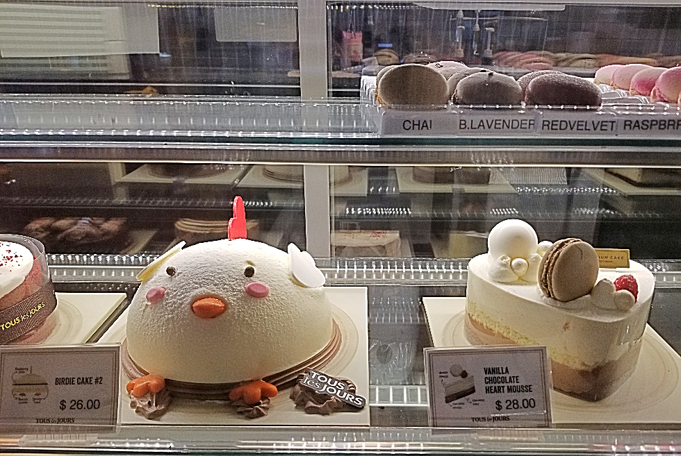 A bird-shaped cake and a heart-shaped vanilla-chocolate mousse cake were some of the unique cakes on display recently at Tous Les Jours Bakery Cafe.