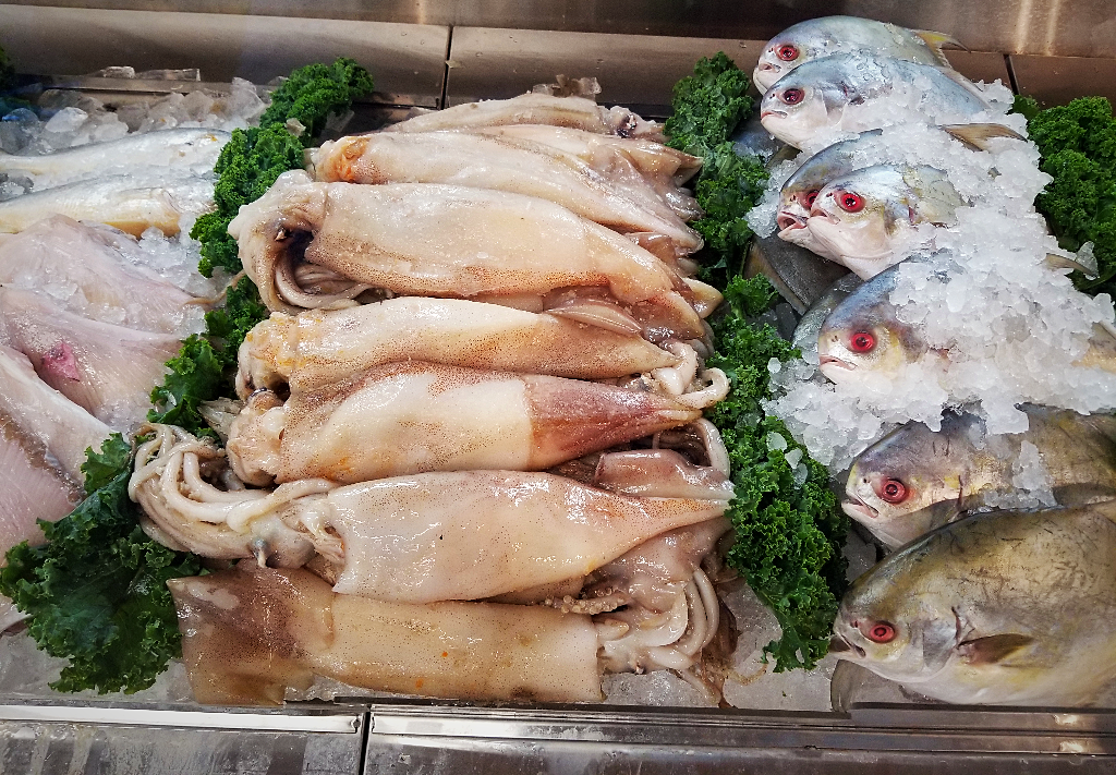 Squid and golden pompano on display at the seafood department inside Asiana Market in Mesa.