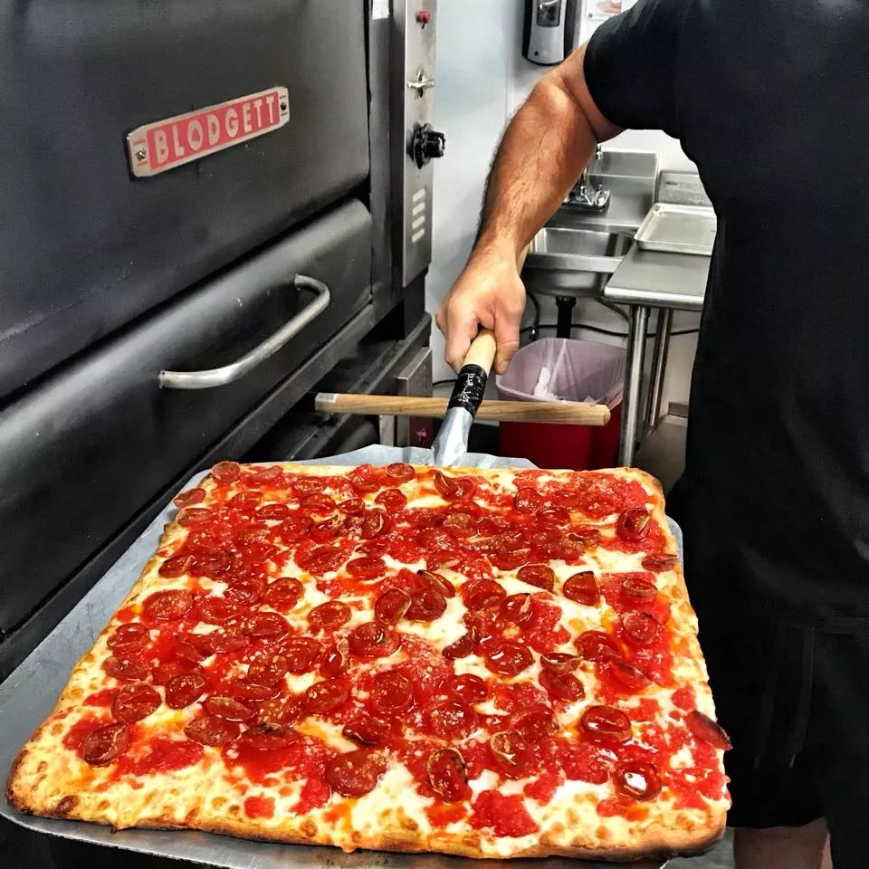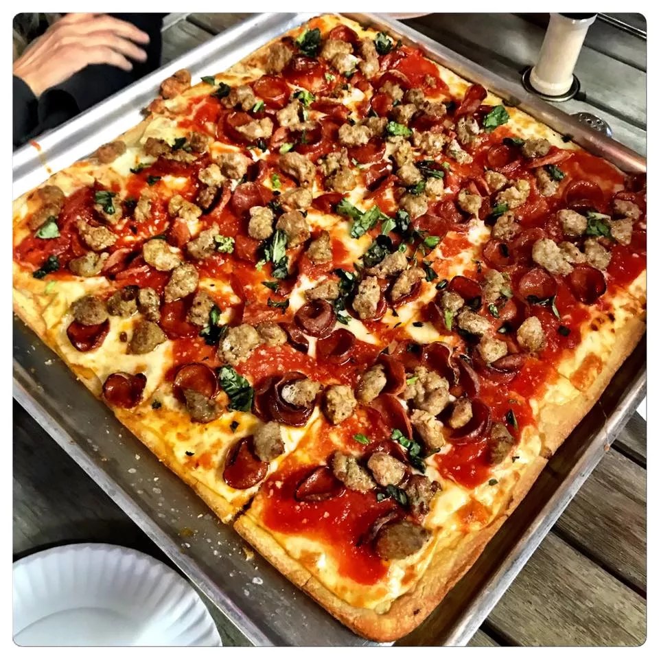 “It’s grandma-style pizza,” he says. “It’s not Sicilian or New York style. It’s in between both.”