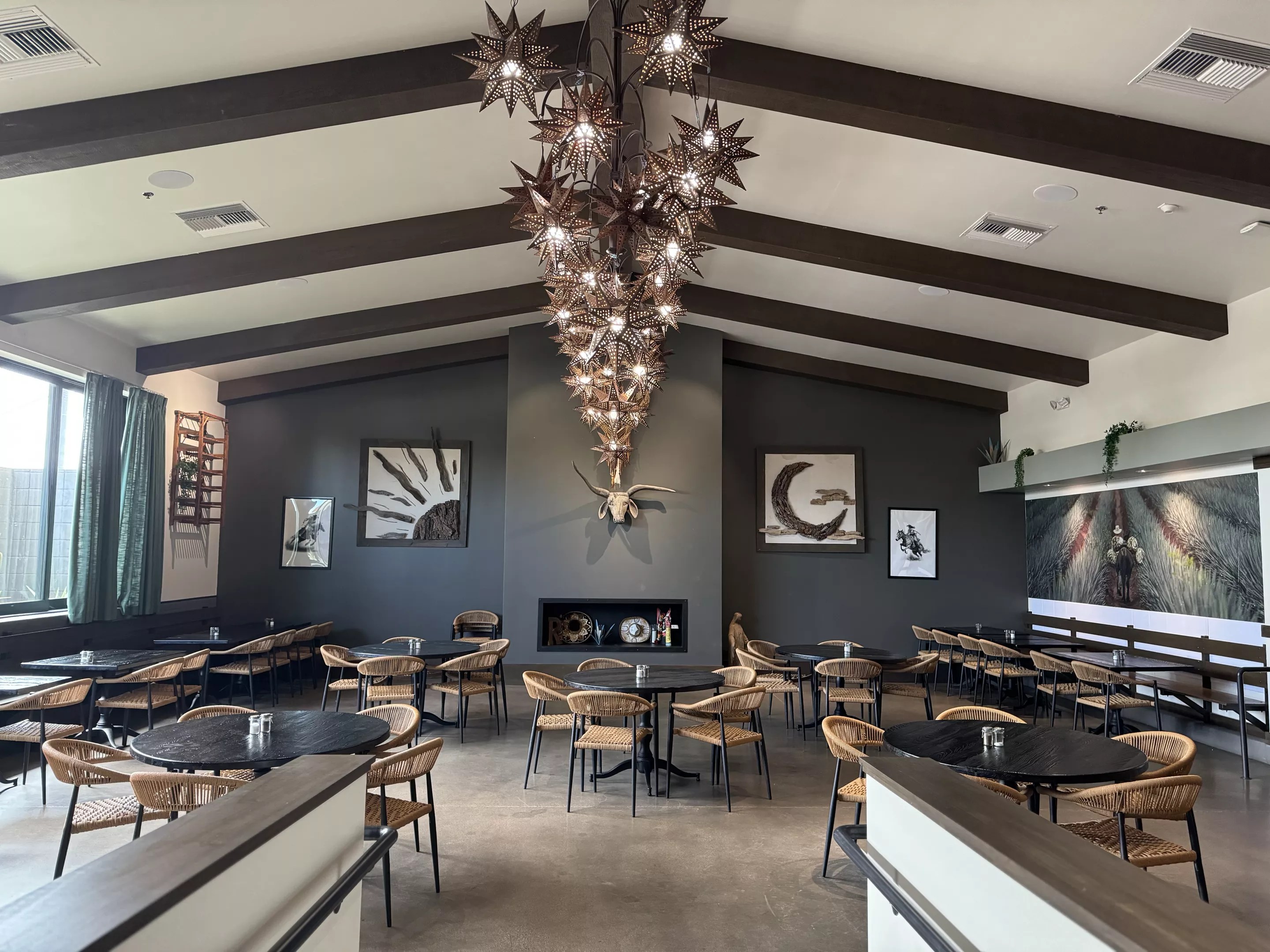 The restaurant has the airy feel of an open-concept home. The main dining room sparkles with star-shaped lanterns, beamed ceilings and a rich, moody palette of grey and walnut.