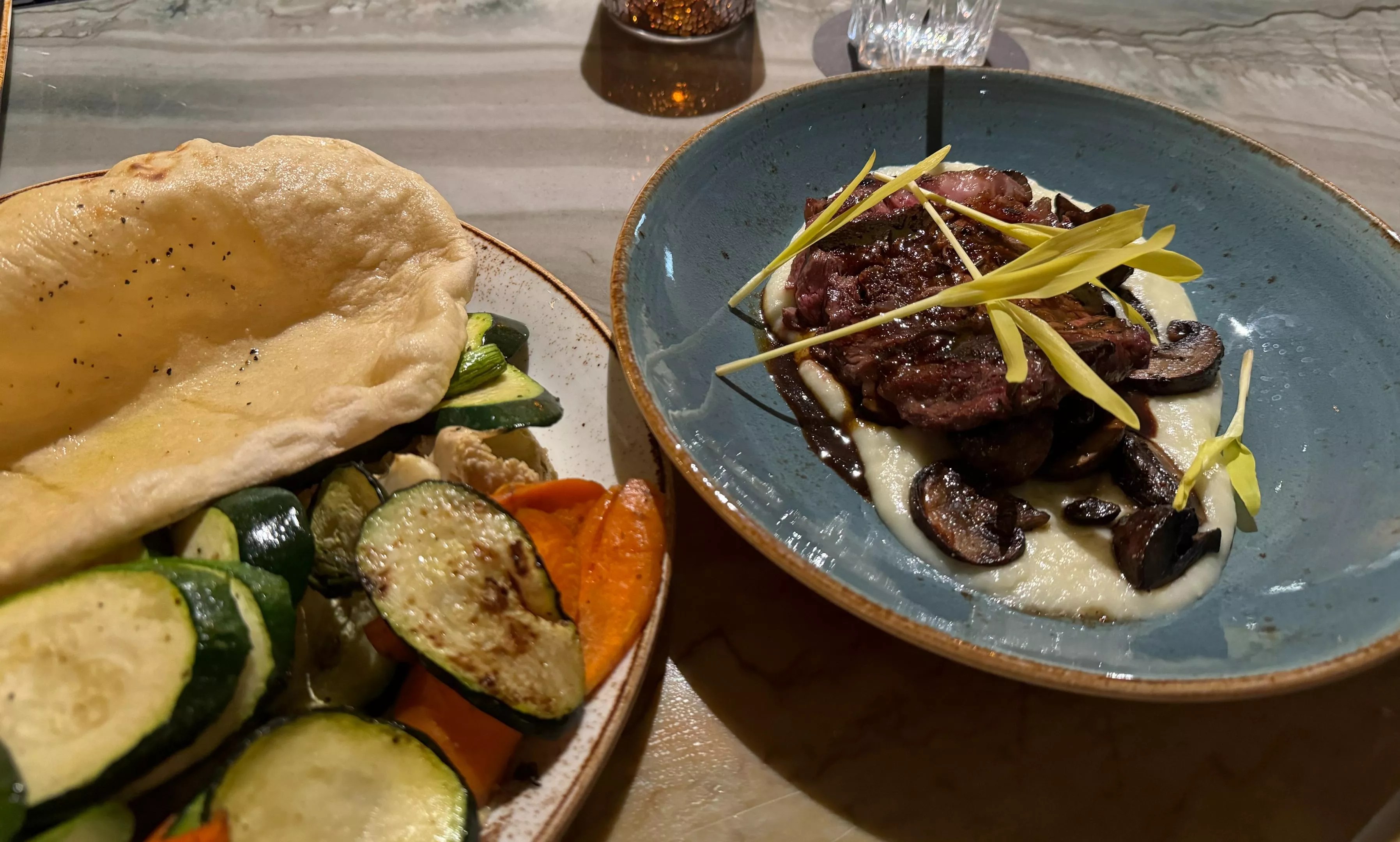 Ribeye and charred vegetables arrived for the next course. The steak was tender and thoughtfully cooked. It’s served atop a potato mash that’s kicked up with horseradish, along with mushrooms and a lightly smoky demi-glace.