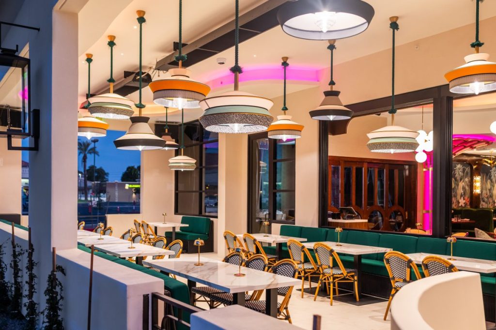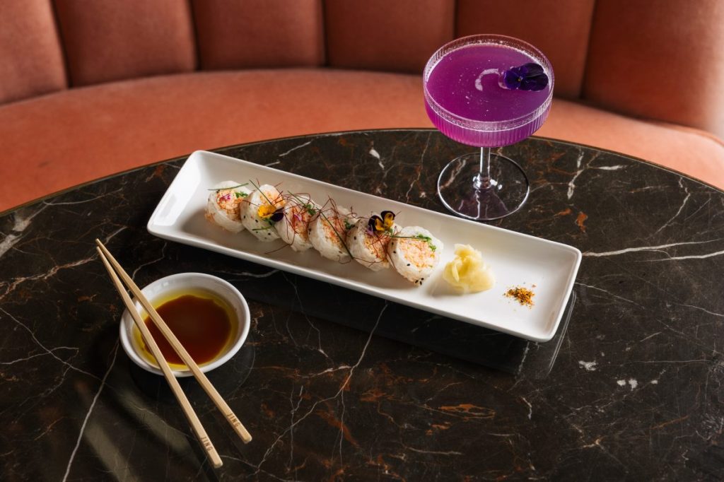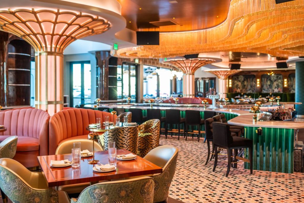 Though the food comes first, the hospitality group wants an atmosphere to match. The Art Deco-inspired space features a curved bar at the center, dividing a more traditional dining room and a lounge that boasts club chairs and scalloped love seats arranged around tables that abut a DJ booth. The entire space is bathed in luxe details, from mosaic stone tiled floors to tropical wallpaper and a showstopping central chandelier.