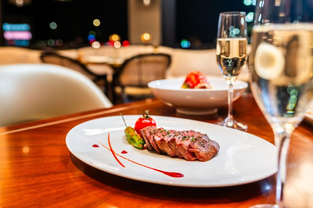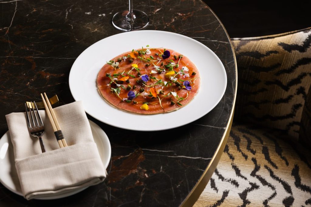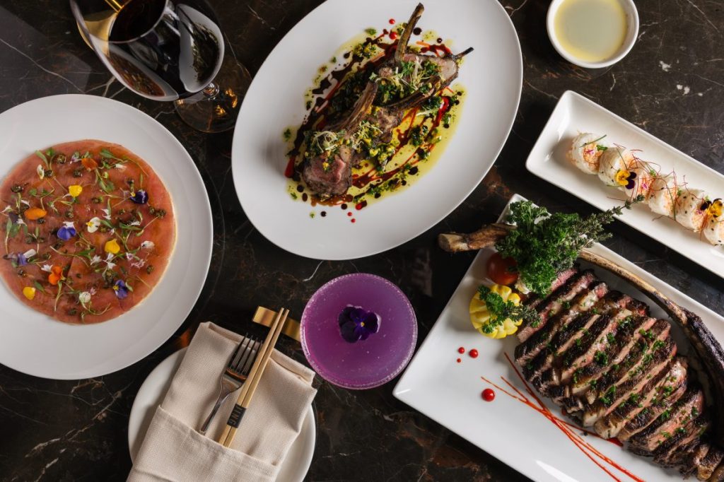 The restaurant serves a mix of sushi rolls, sashimi and shellfish platters along with dumplings, fried rice and meats cooked on a Spanish Josper grill. American steakhouse staples, including a Caesar salad, garlic French fries crisped in duck fat and a 14-ounce Delmonico ribeye, can be ordered alongside Peking duck, spicy pork wontons and prawn garlic noodles.
