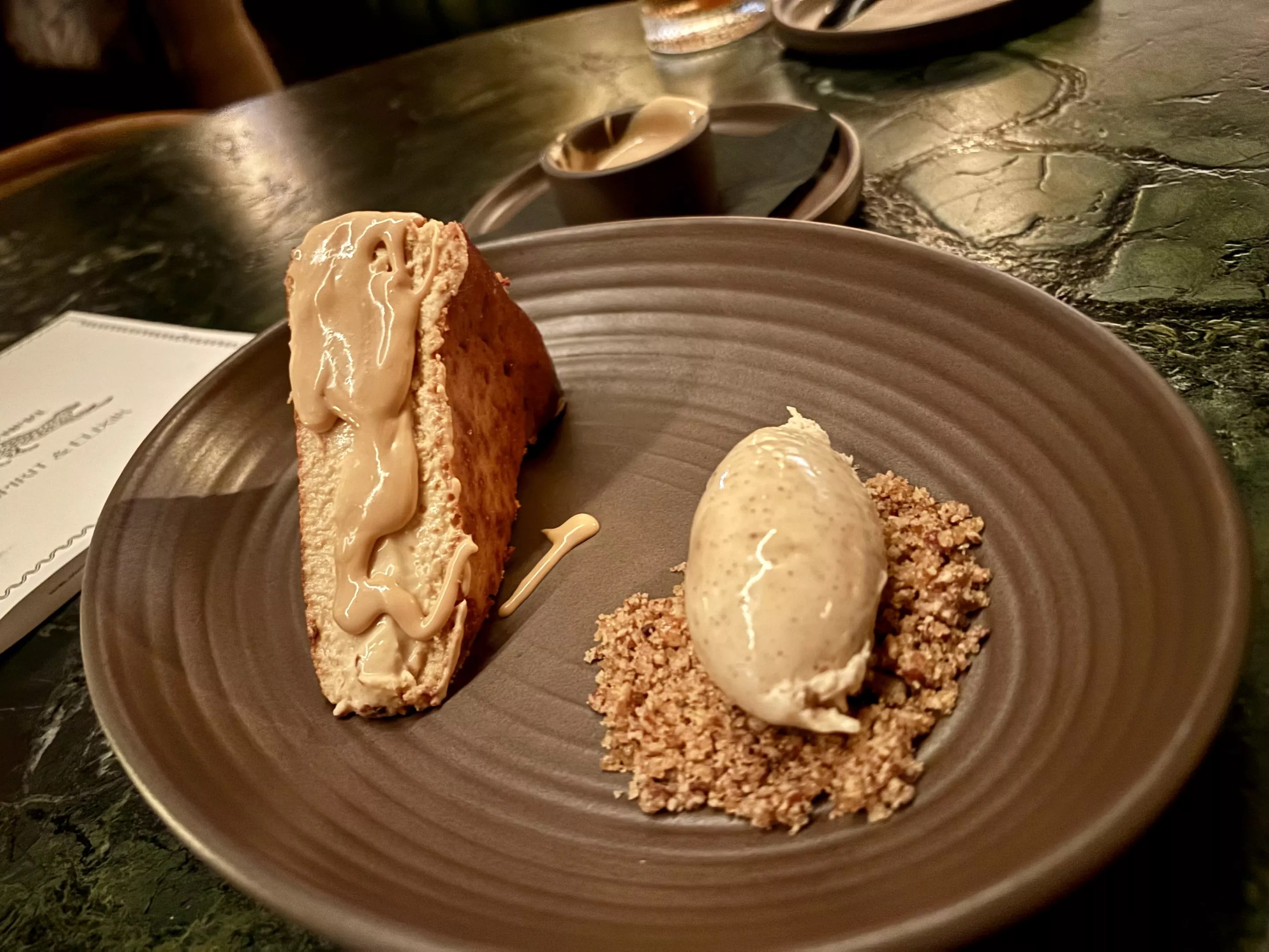 A slice of baked cheesecake arrived turned on its side with a quenelle of something like ice cream. A sweet, apprehensive server performed the tableside dulce de leche service, which involved him struggling to pour a small ramekin of thick, pale caramel over the slice.