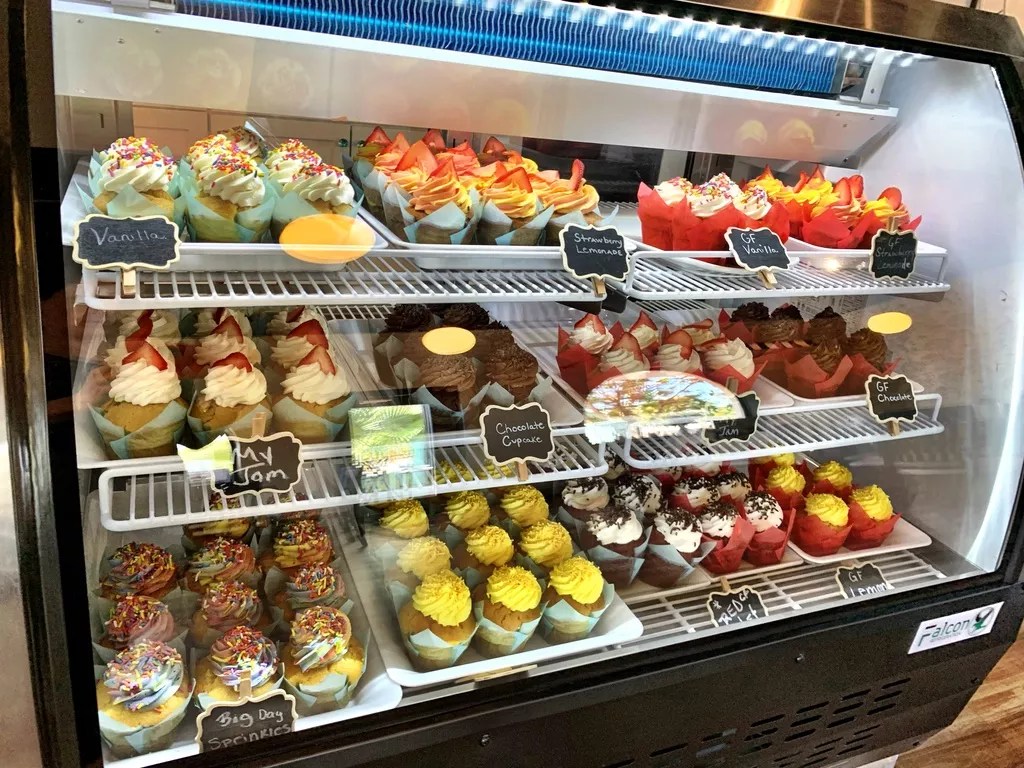 In addition to muffins, cupcakes, and ice cream, the bakery offers coffee, cookies, brownies, and cinnamon rolls. Behind the counter, a screen presents bits of information about the offerings.