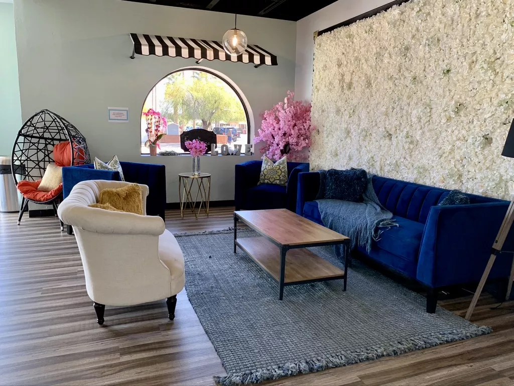 To the left is the Instagram area: a royal-blue sofa juxtaposed against a floral wall of white roses. If that’s not your jam (pun intended), then maybe the red egg chairs will do the job.