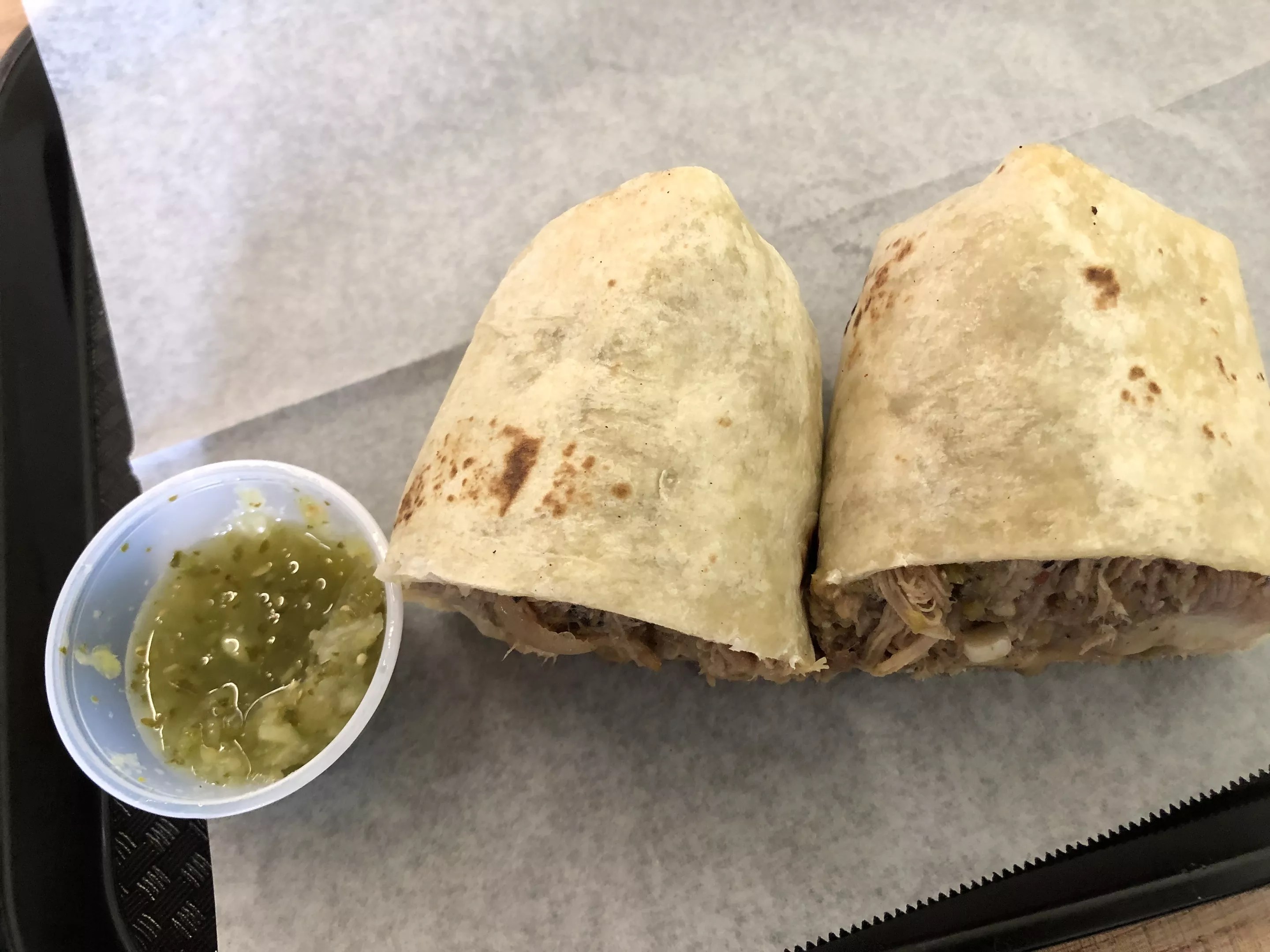 Green chile burrito from Hatch-It, side of salsa at the ready.