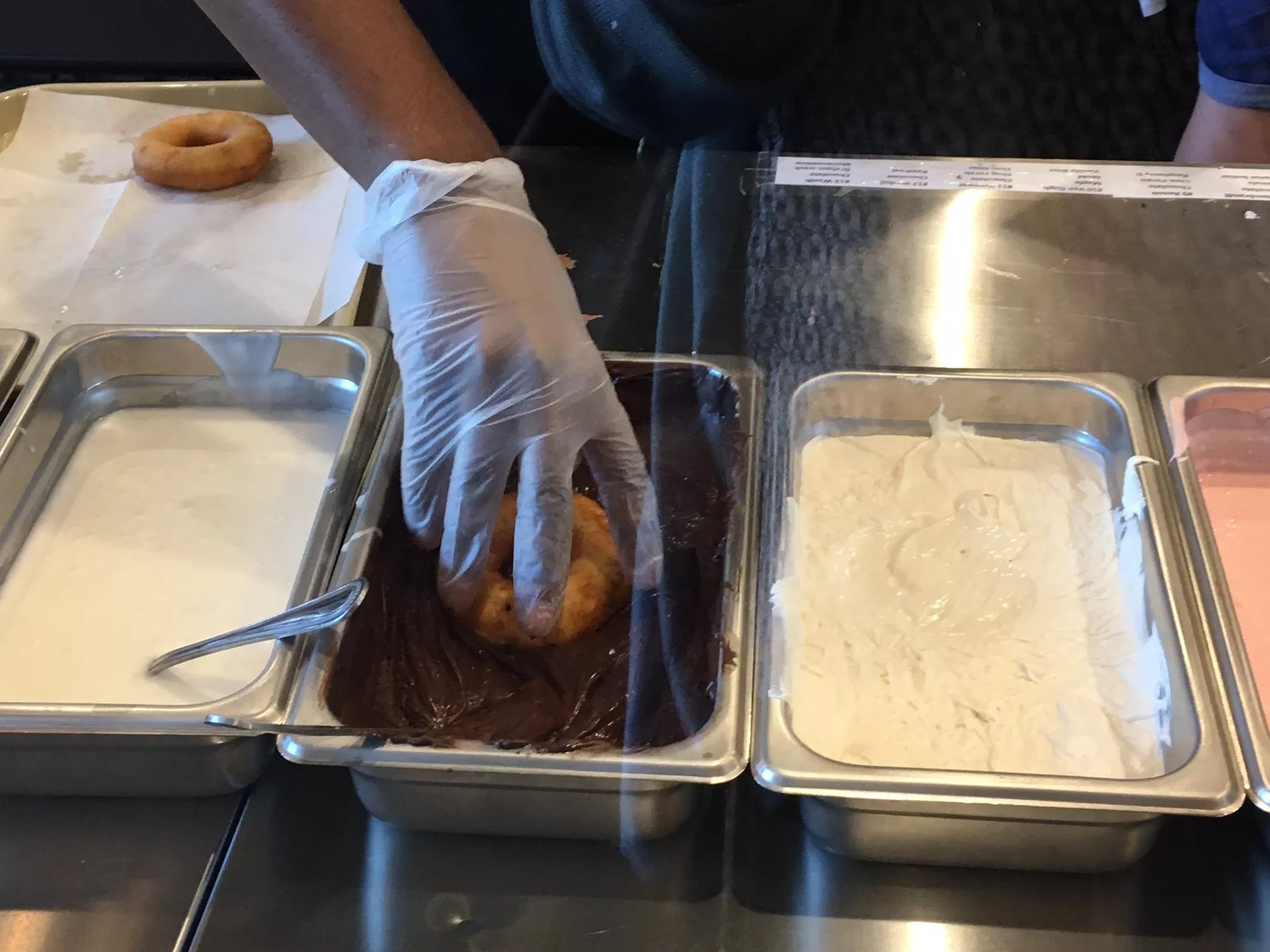 Satisfied with my daring choices, I ordered an Illy latte and watched the dough drop into the fryer before being deftly dunked in frosting, toppings, and drizzles by the friendly staff.