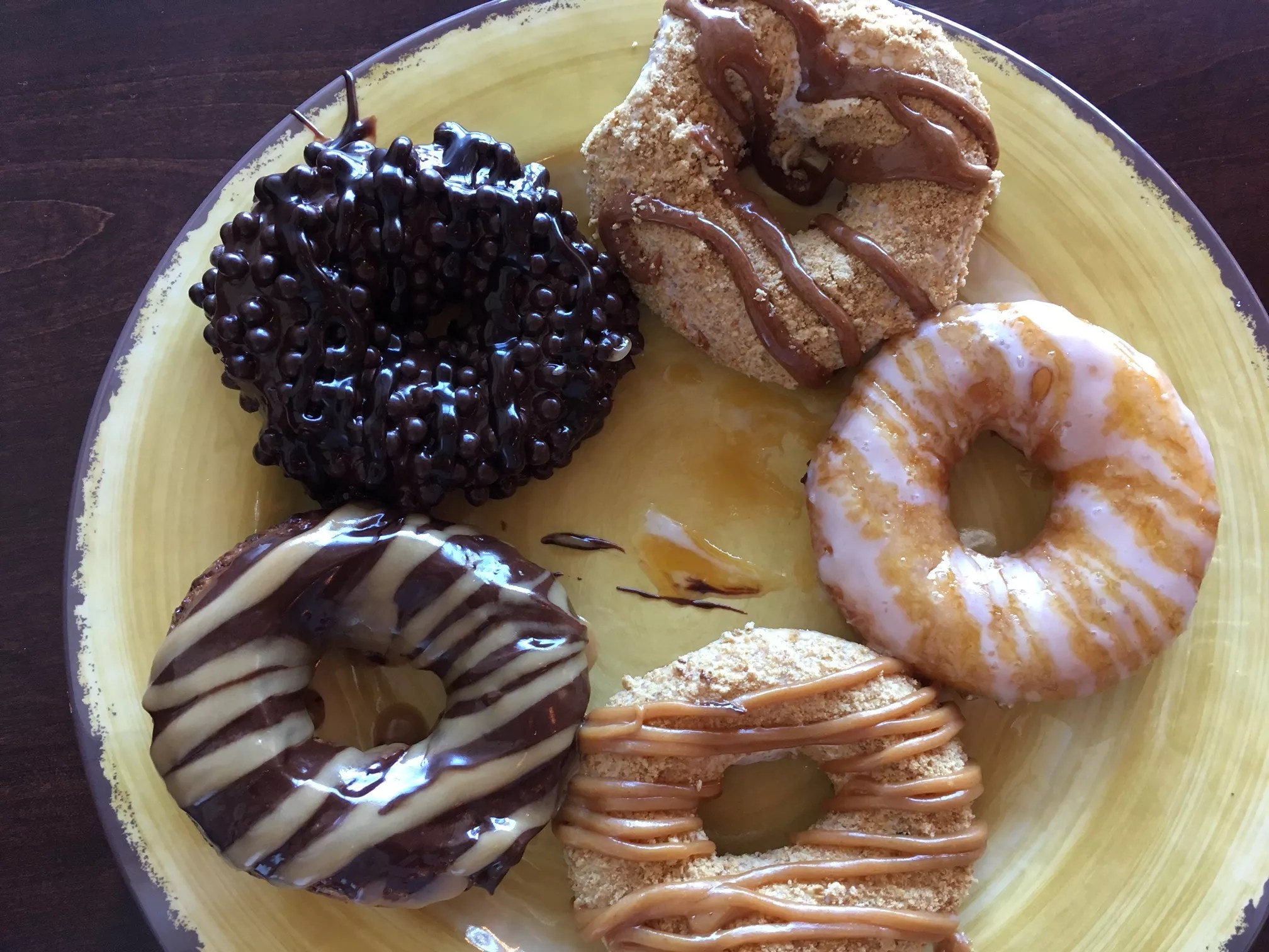 There’s an overwhelming number of combination options: The icings come in vanilla, chocolate, strawberry, maple, and glaze; the toppings are rainbow sprinkles, chopped peanuts, Oreo crumbles, miniature M&Ms, chocolate pearls, sea salt, graham cracker crumbs, or cinnamon sugar; and the drizzles can be vanilla, chocolate, marshmallow, caramel, cinnamon, raspberry, peanut butter, or espresso.