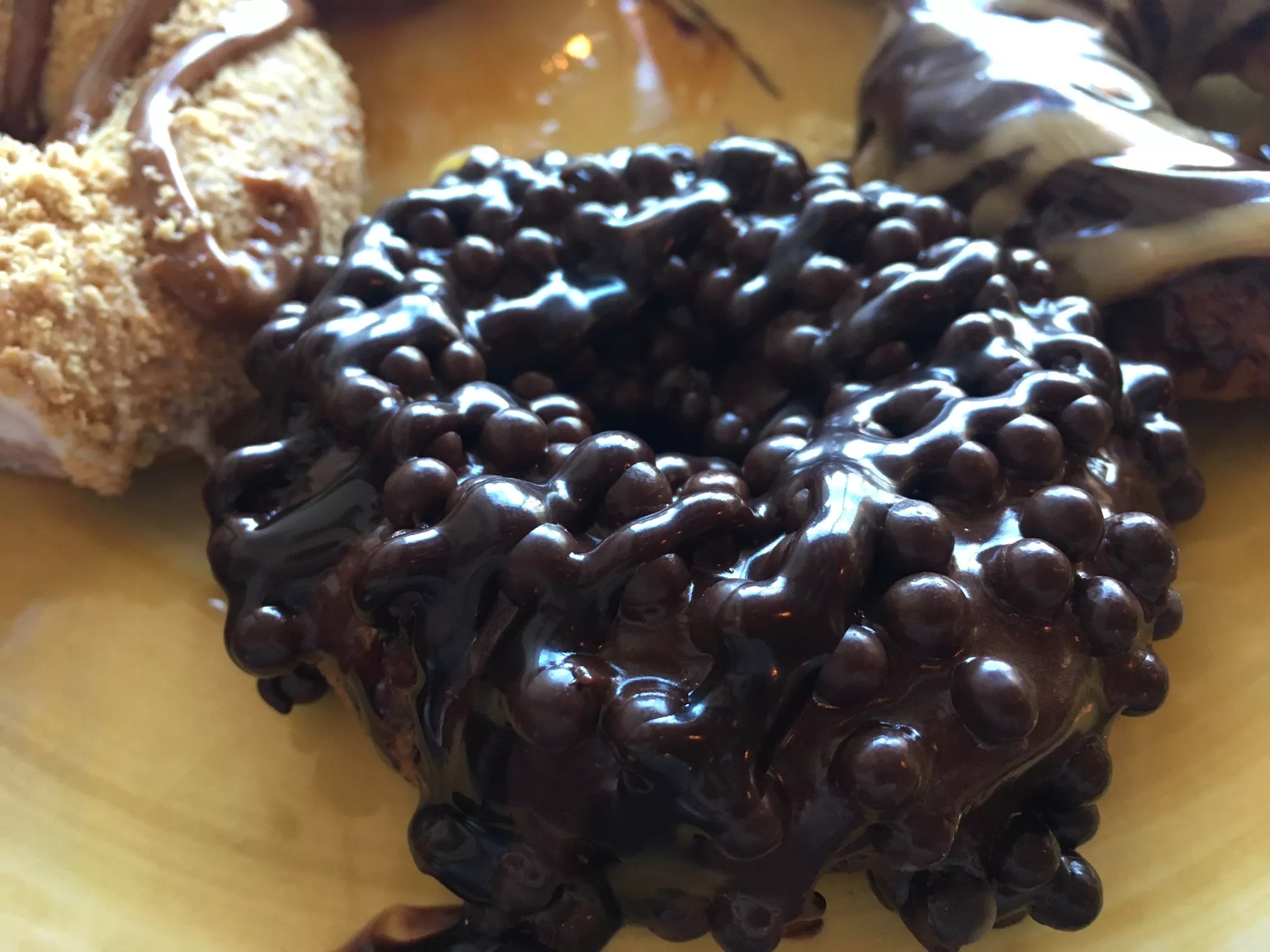For those who are less creative first thing in the morning or crippled with indecision when faced with such a massive number of options (like I was), the menu of predesigned doughnuts are really fun to choose from as well, with photos and flavor descriptions provided along with the more vague and artful name. I selected the Monet, which was glazed, topped with sea salt, and drizzled with caramel; a Kahlo, iced with chocolate and drizzled with espresso; Vermeer, a chocolate overload of icing, pearls, and drizzle; and I tried to order an Oreo-topped Picasso, but selected the Pissarro by mistake, which earned me a vanilla-iced, graham-topped, cinnamon-drizzled doughnut.
