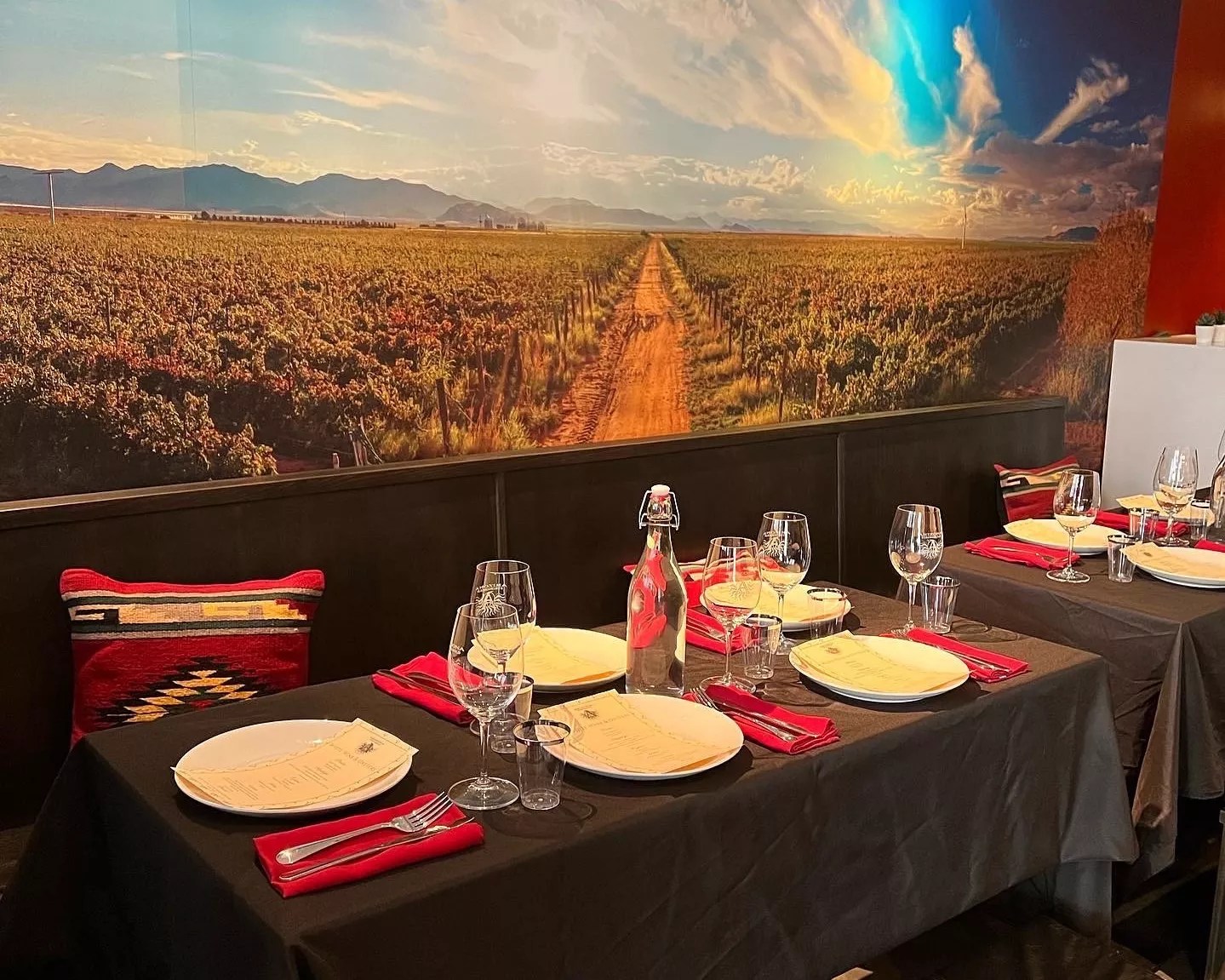The tasting room has a capacity of 50 inside plus additional seating on the patio. The furnishings present a sophisticated Southwest vibe with comfy leather seat cushions, benches that flank wooden community tables, splashes of red on the walls, and photo murals of the vineyards.