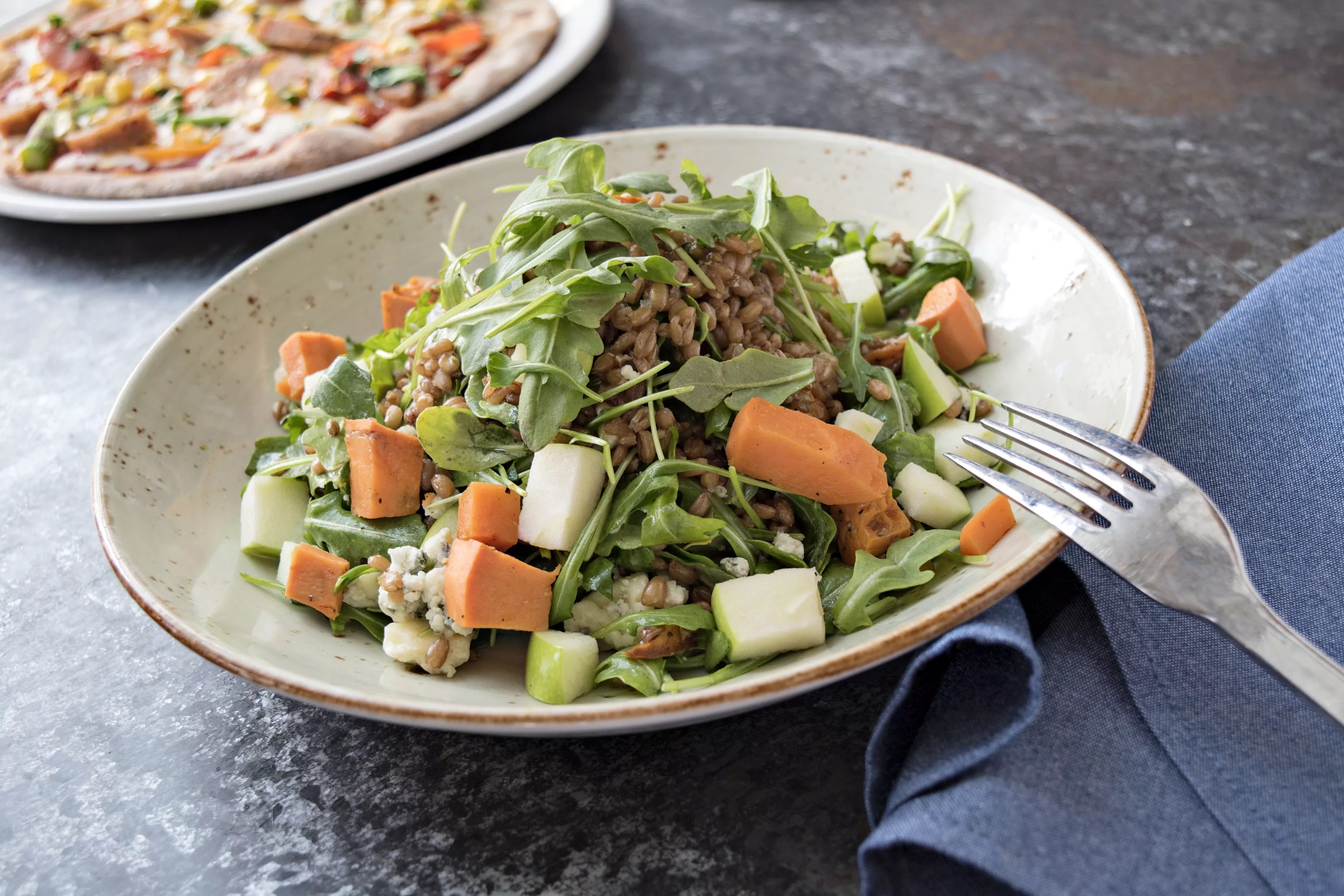 The Harvest salad comes with grains, arugula, sweet potato, green apple, and blue cheese.