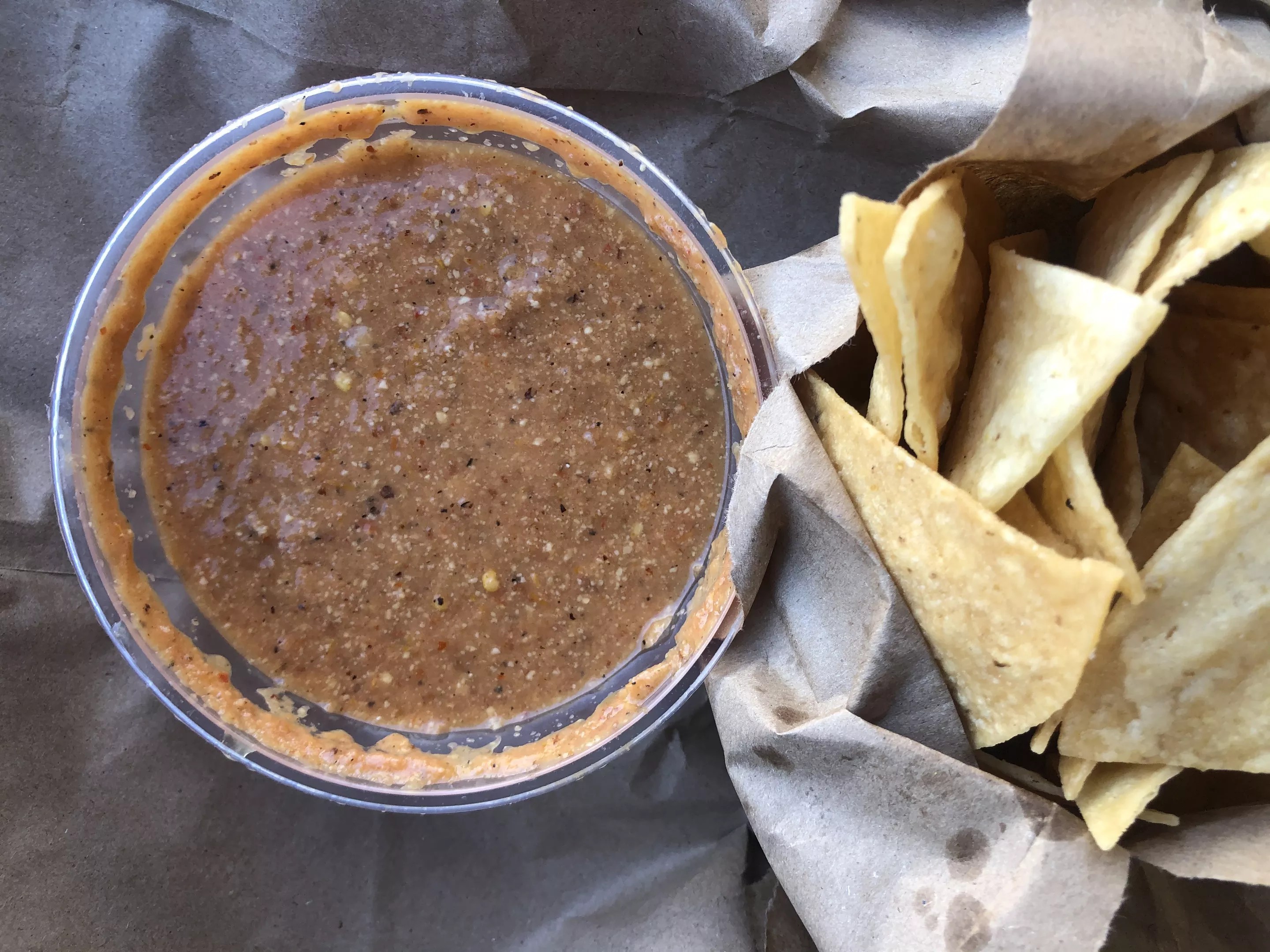 Chips and a salsa made from chile de arbol and almonds.