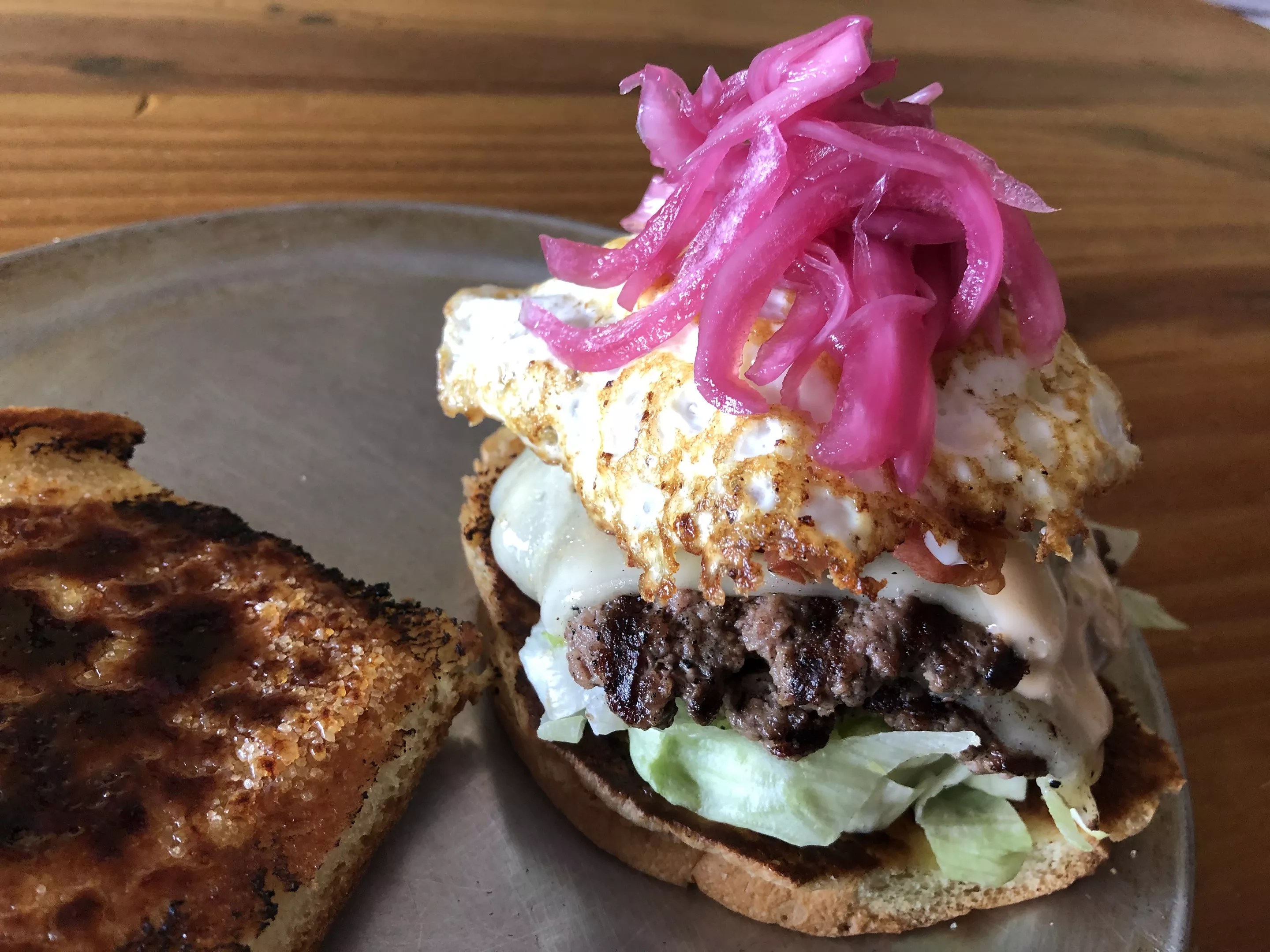 The famous Brulee Burger at Paradise Valley Burger Co. is topped with bacon, egg, havarti cheese, pickled onions, and Thousand Island dressing and served on a burnt sugar bun.