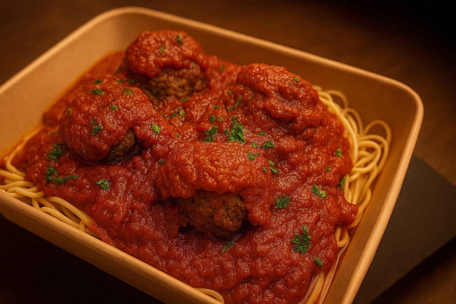 A medium build-your-own pasta meal with meat sauce and meatballs, one of the restaurant’s customizable options.