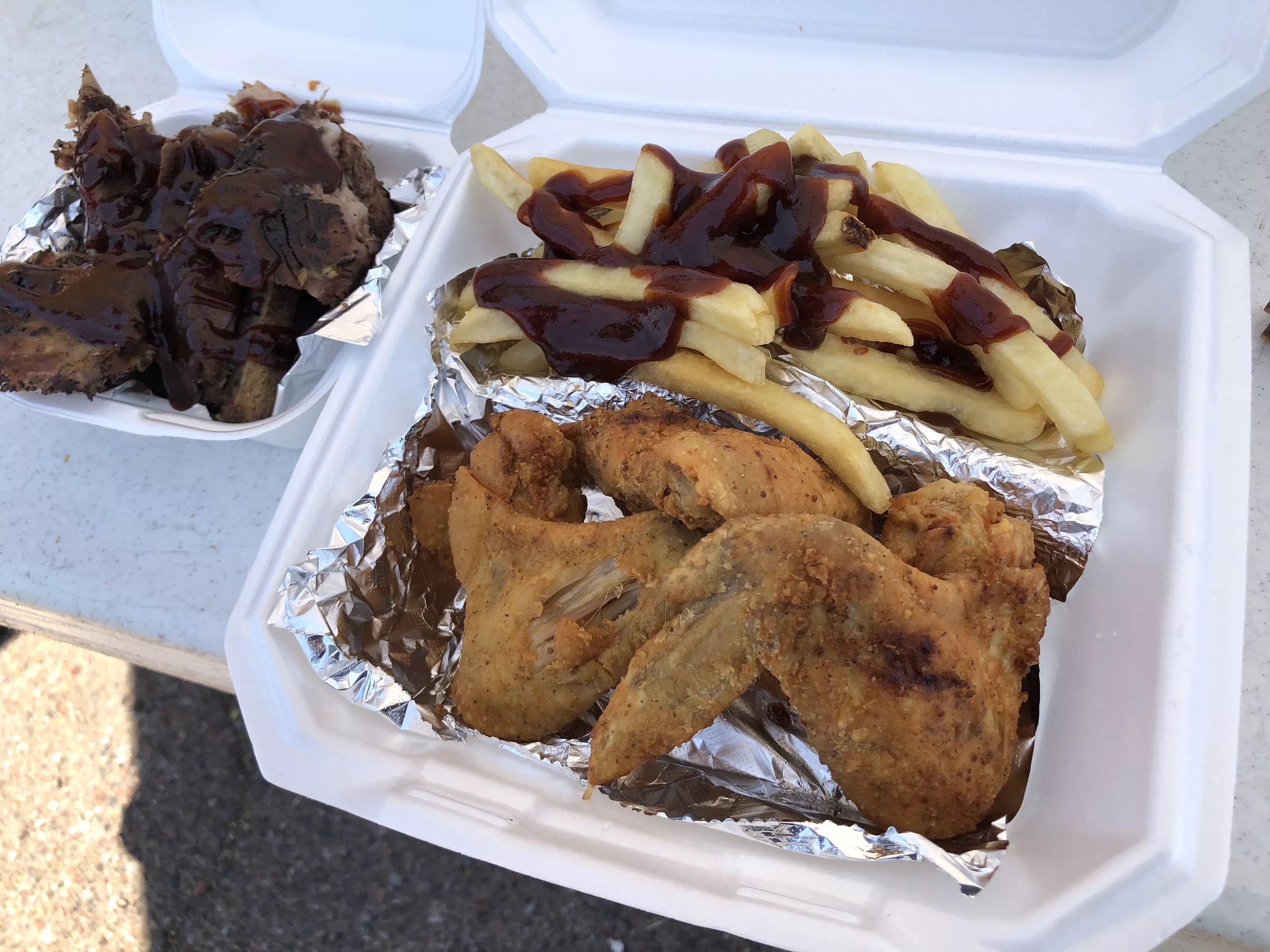 Fried chicken wings, fries, and rib tips outside of Holy Haven Ministries.