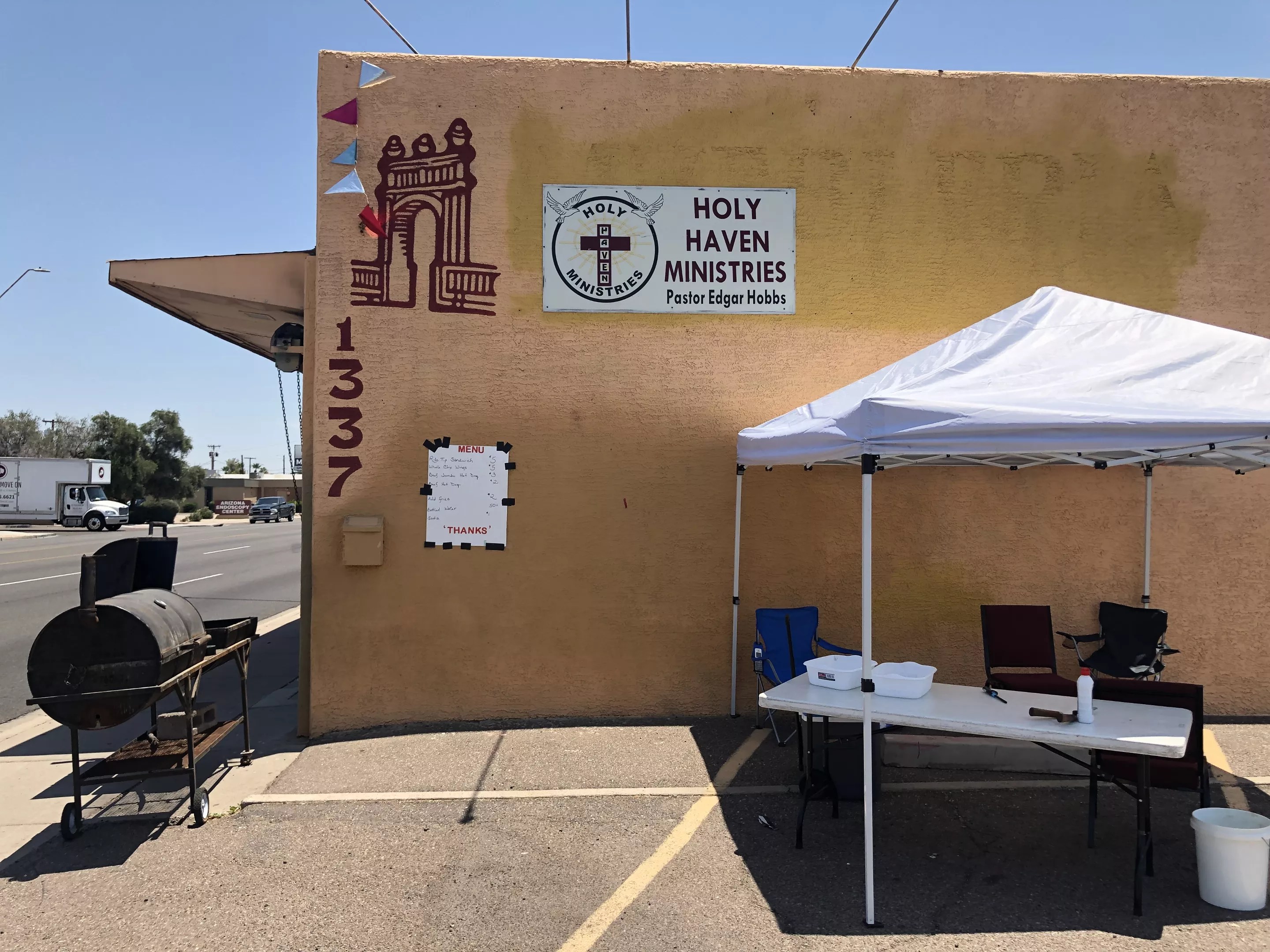 The grill stood at the cusp of the lot, a few feet from McDowell Road between 13th and 14th streets, at the corner of a beige stucco building. That building is the pastor’s church. Edgar founded this church, Holy Haven Youth Ministry Victim of Circumstance Sinner (VOCC). His church is “a Bible-believing teaching church” that goes strictly by the word of the Bible. Though it isn’t linked with any Christian denomination, the pastor doesn’t call his church nondenominational. But that’s inside. Outside, the church has a handwritten paper menu taped by the grill.