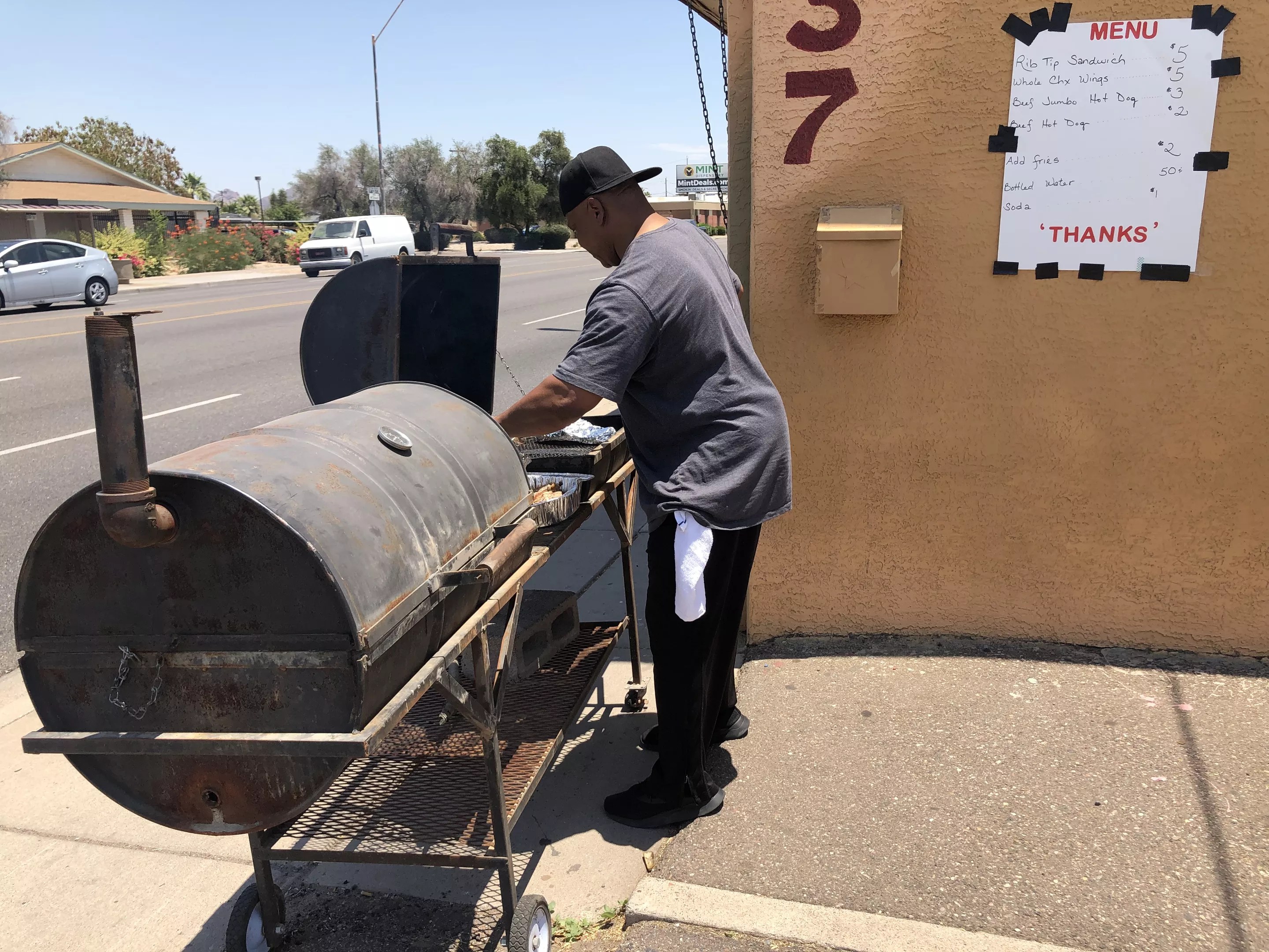 Two Fridays ago, when driving to meet friends for lunch, I noticed a barbecue rig on the side of McDowell Road that had never been there before. Or I thought it was a barbecue rig. It just kind of flashed by – a black grill of two half barrels, with a little chimney puffing smoke. I would have turned around, but I had friends to meet. But the following Friday, the grill was there again.