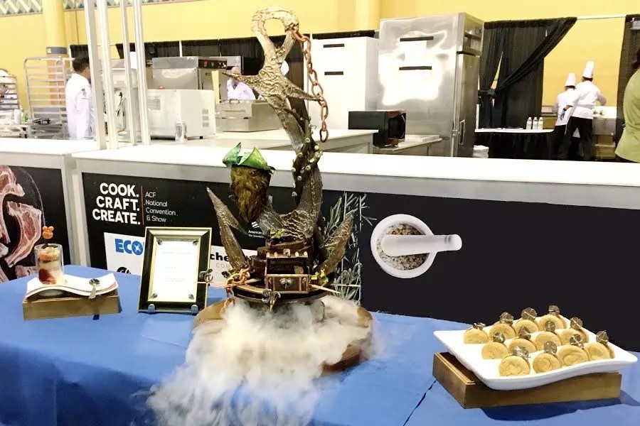 Four stainless steel stations are outfitted with orange mixers and a container of baking utensils. Ovens, racks, and a large refrigerator stand at attention against one wall. The chef’s many awards fill the opposite wall. There are enlarged photos of two chocolate showpieces. One won him the gold medal at the National Team Pastry Championship, Desert Ridge, in 2009, the other for his 2017 Disney villain piece. One can’t help but feel intimidated to meet the chef in person, that is, until he and his business manager and wife, Abby Boman, welcome you with hugs.