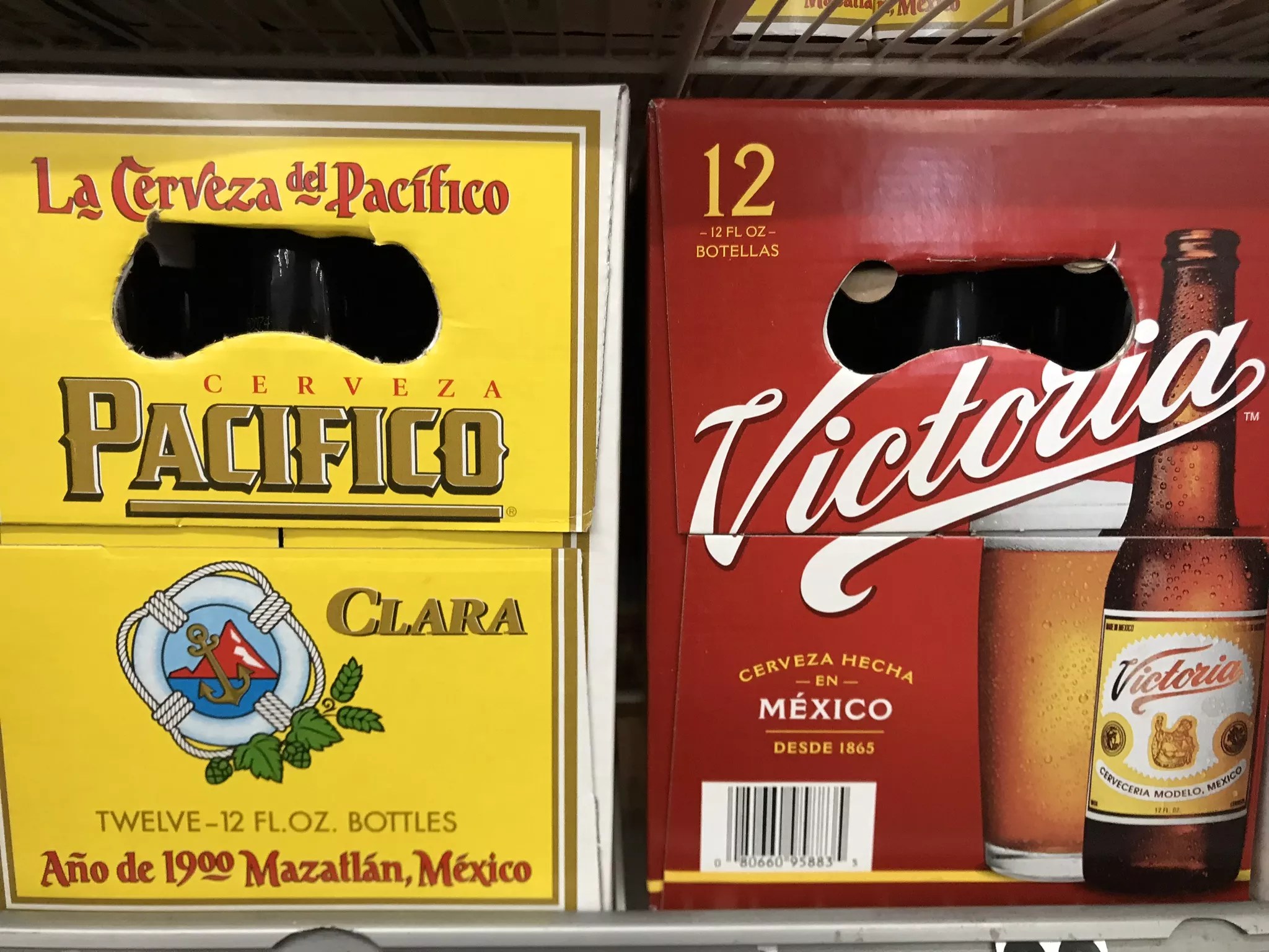 Two boxes of imported Mexican beer, which would have been affected by Trump’s tariffs, for sale at Fiesta Market & Liquor.