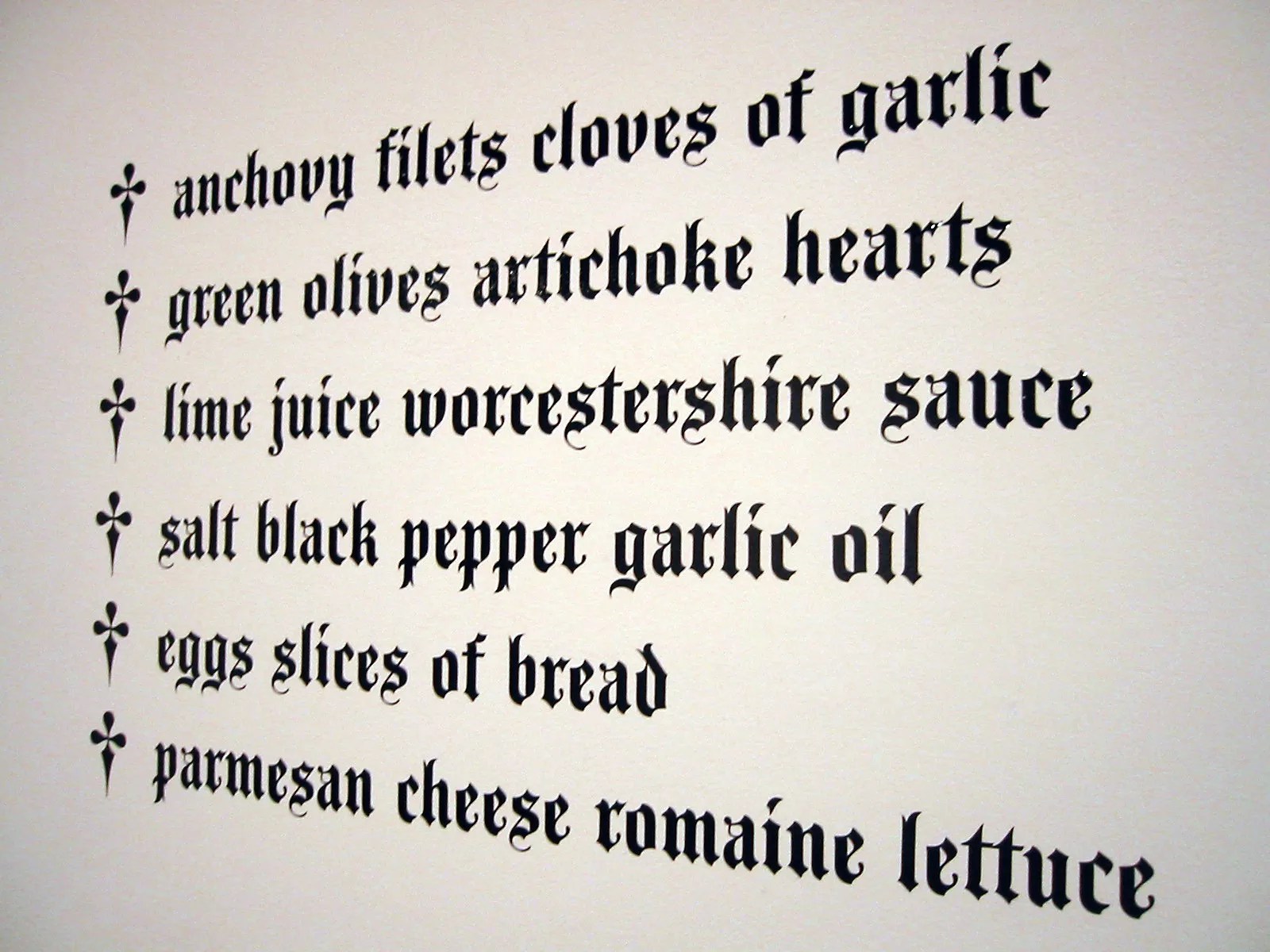 His list features more than a dozen ingredients – anchovy filets, cloves of garlic, green olives, artichoke hearts, lime juice, Worcestershire sauce, salt, black pepper, garlic oil, eggs, slices of bread, Parmesan cheese, and romaine lettuce.