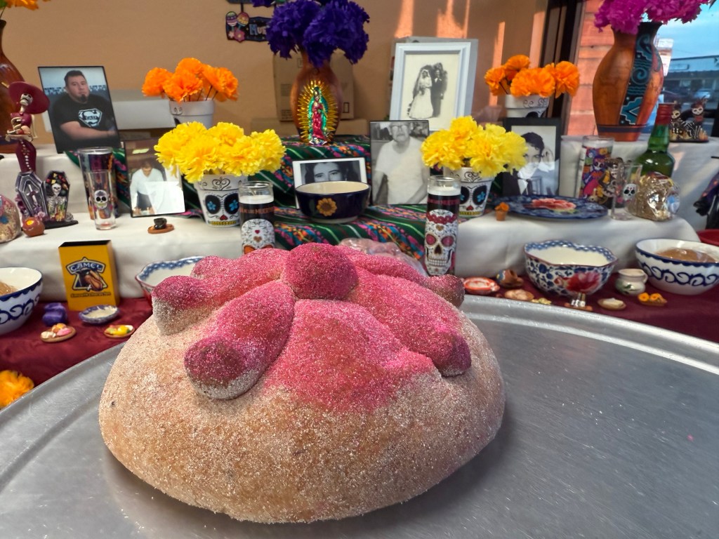 The altars typically showcase the photos of their departed, flowers, the muertos’ favorite foods, drinks, and of course, pan de muerto.