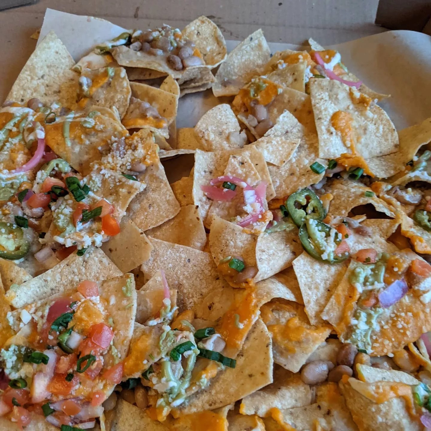Trash Panda Vegan The Sheet Pan Nachos at GuacStar Kitchen and Cantina include pickled Fresno chili peppers. Niki D’Andrea