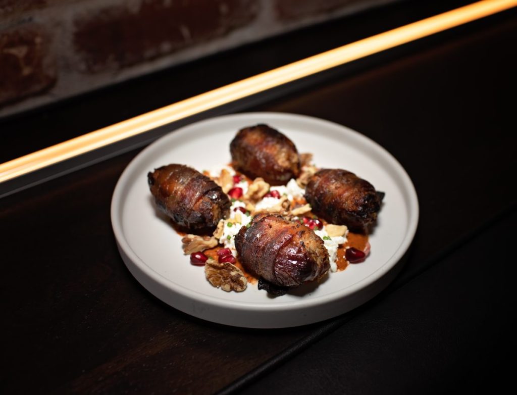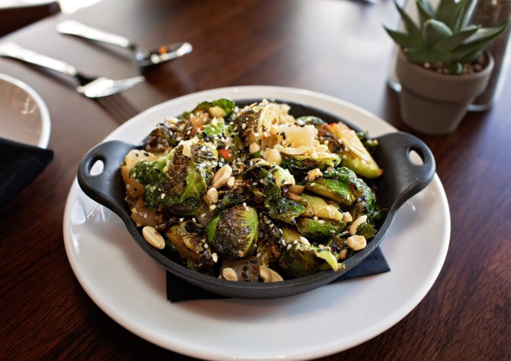 For example, there are bacon-wrapped dates with goat cheese, pomegranate seeds and muhammara, a red pepper walnut dip from the Middle East. Crispy Brussels sprouts are paired with roasted peanuts, sesame, Asian pear and nuoc cham, a citrusy Vietnamese fish sauce.