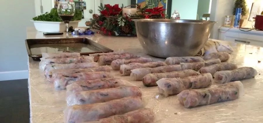 The spring rolls include ground pork, water chestnuts, bean sprouts, black fungus, green onions, white pepper, ginger, and other spices. “You make almost like a meatloaf,” Robson says, before rolling them up and frying them.