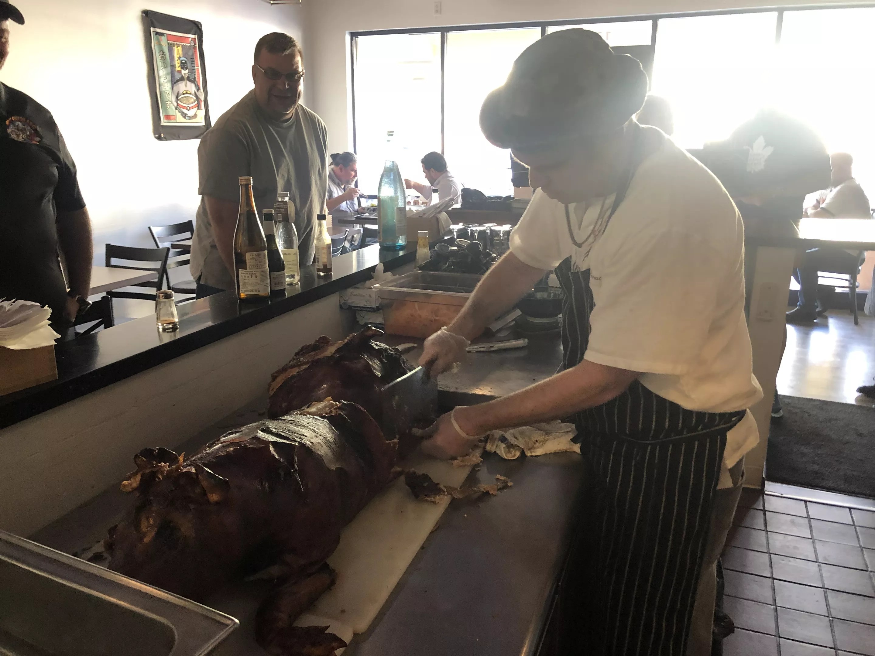 Brian Webb portioning lechon baboy in Hot Noodles, Cold Sake.