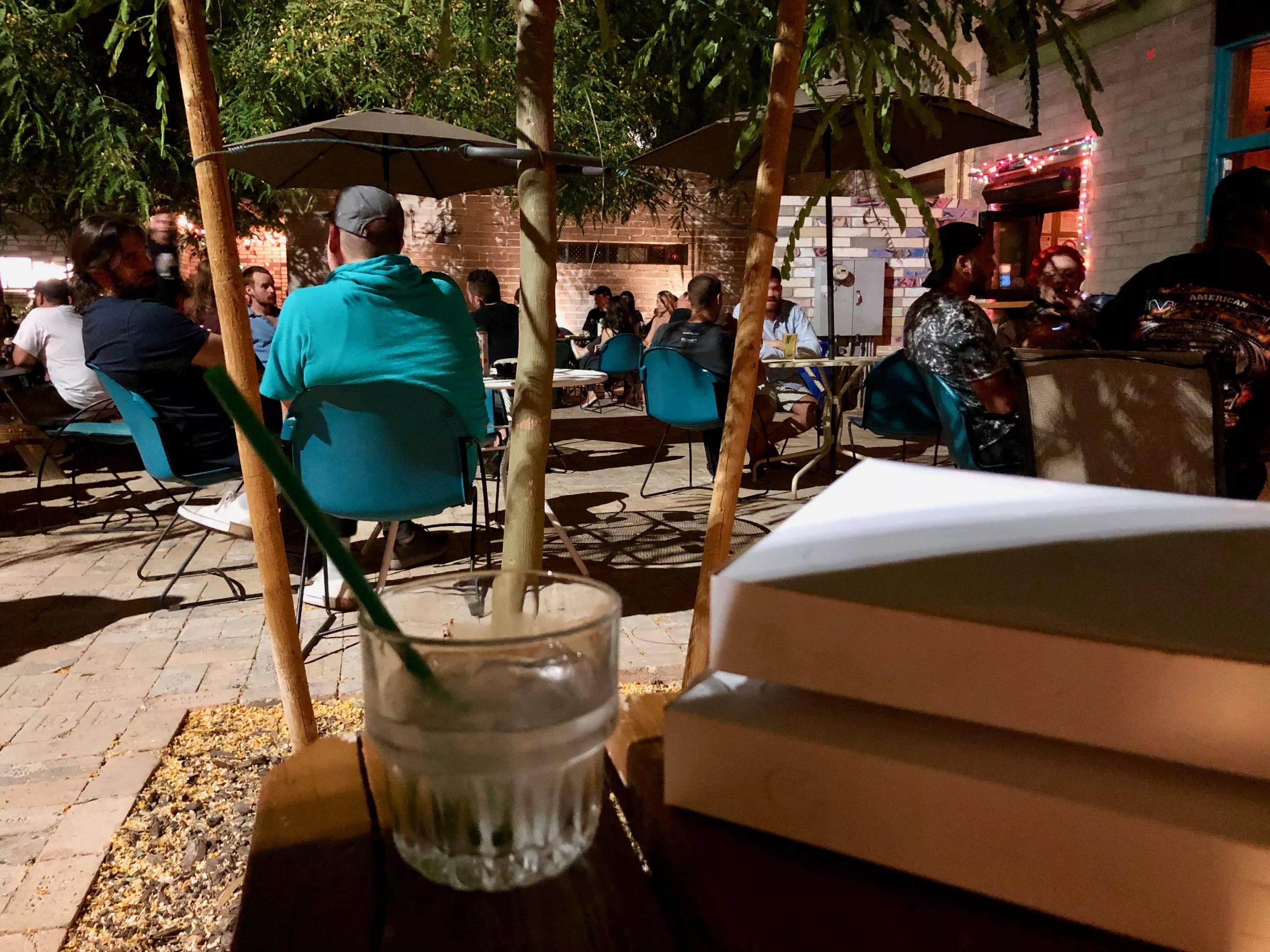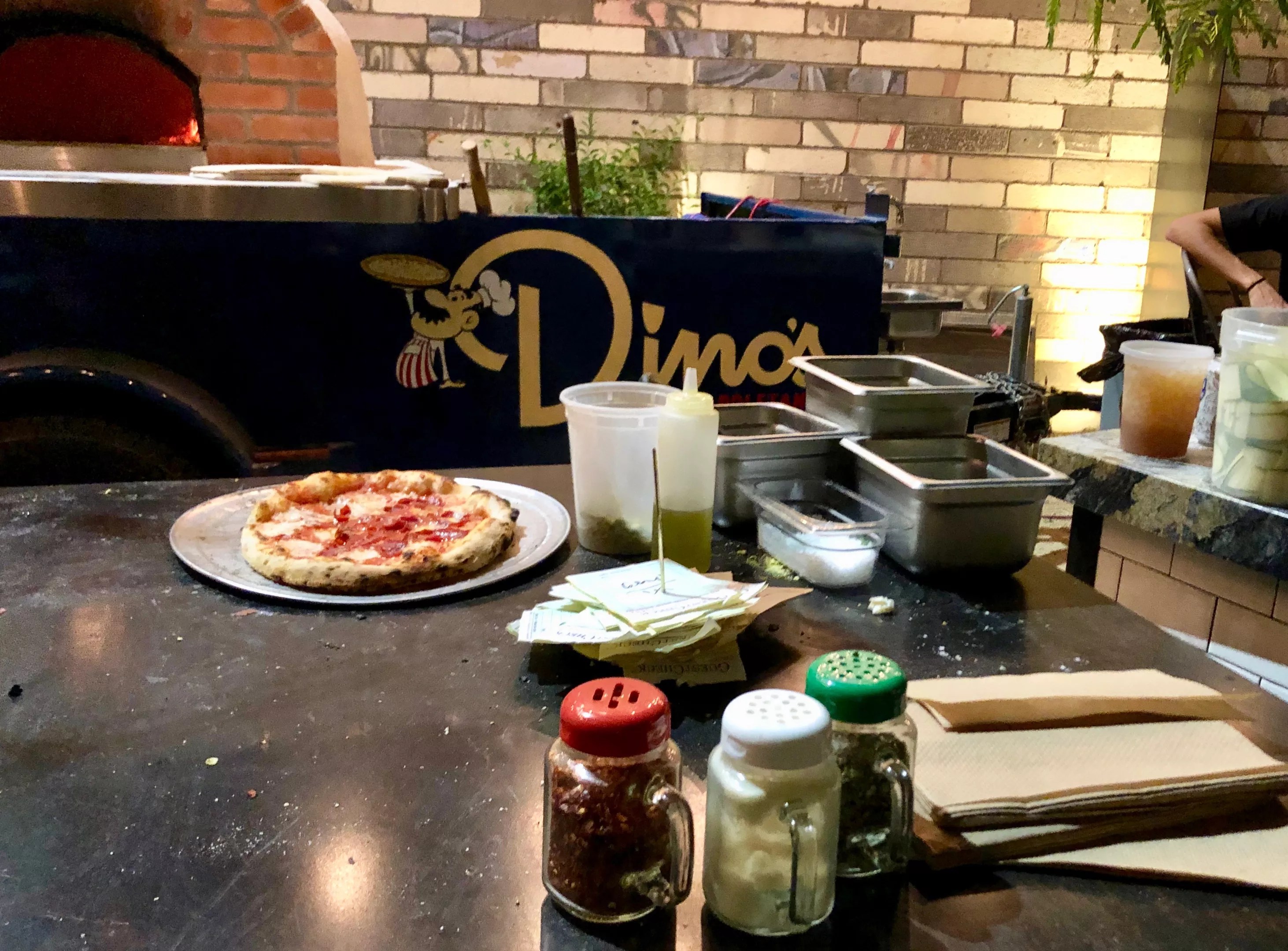 Dino’s setup is an order podium, a prep table, and a wood-fired oven. A small team of order-takers and pizza-makers shuffle by one another. Keep an ear out for your name, or try to over the DJ music, and then you’re free to pop back to your patio table or inside the lounge with your boxed pizza.